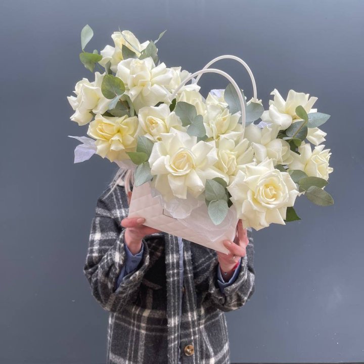 15 белых роз в сумочке