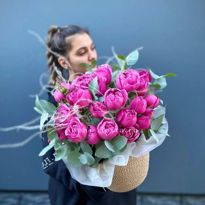 Пионовидные розы Мисти Бабблс в джутовом кашпо