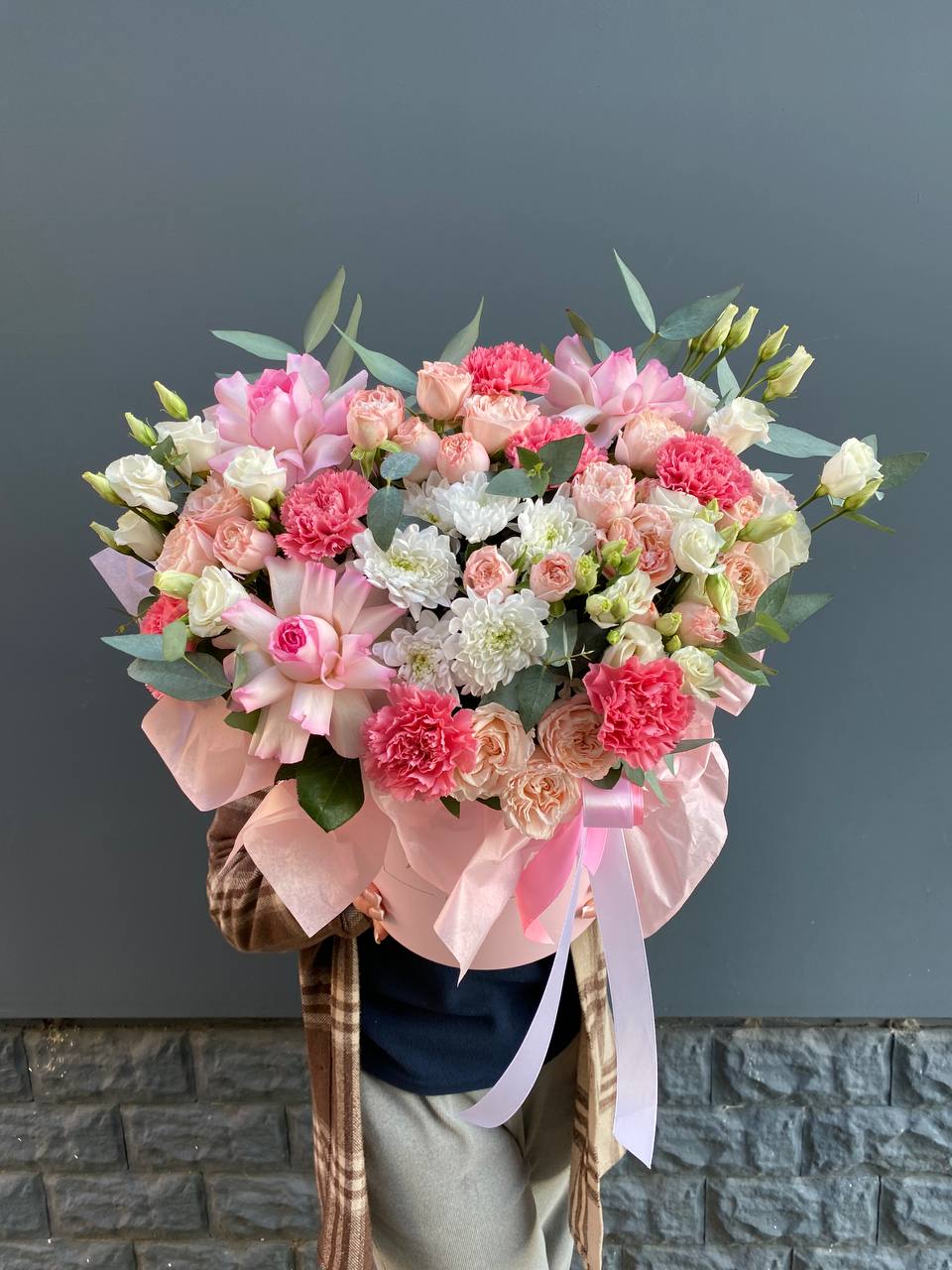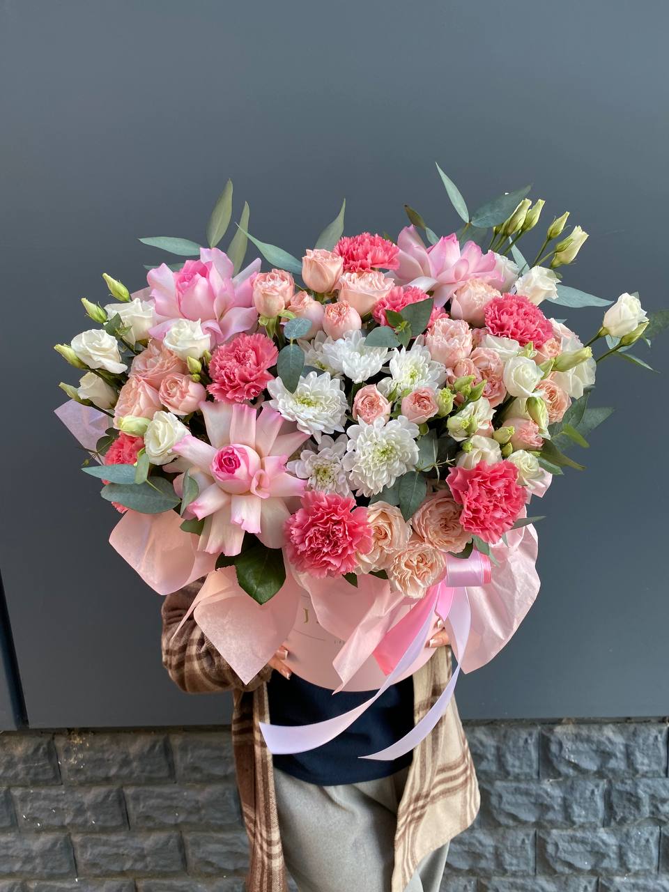 Пышная композиция в круглом боксе с розами бомбастик, хризантемами и эустомой создает объемное цветовое пятно. Диантус добавляет воздушности, а эвкалипт собирает всю палитру в единый ритм.