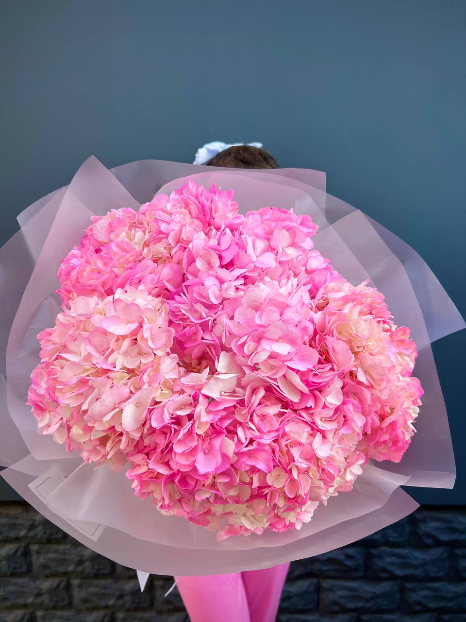 гортензия, белые розы, гипсофилы (или мимоза), эустомы, герберы, хлопок, лента и дизайнерская пленка.