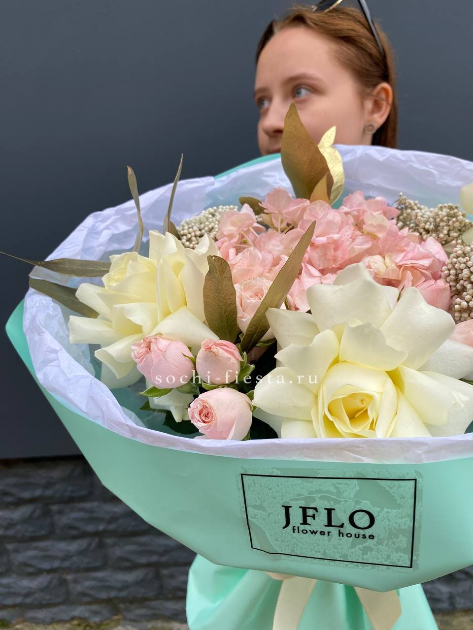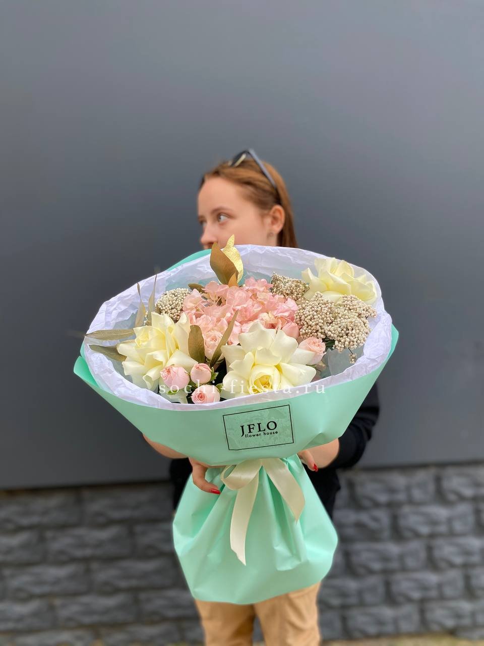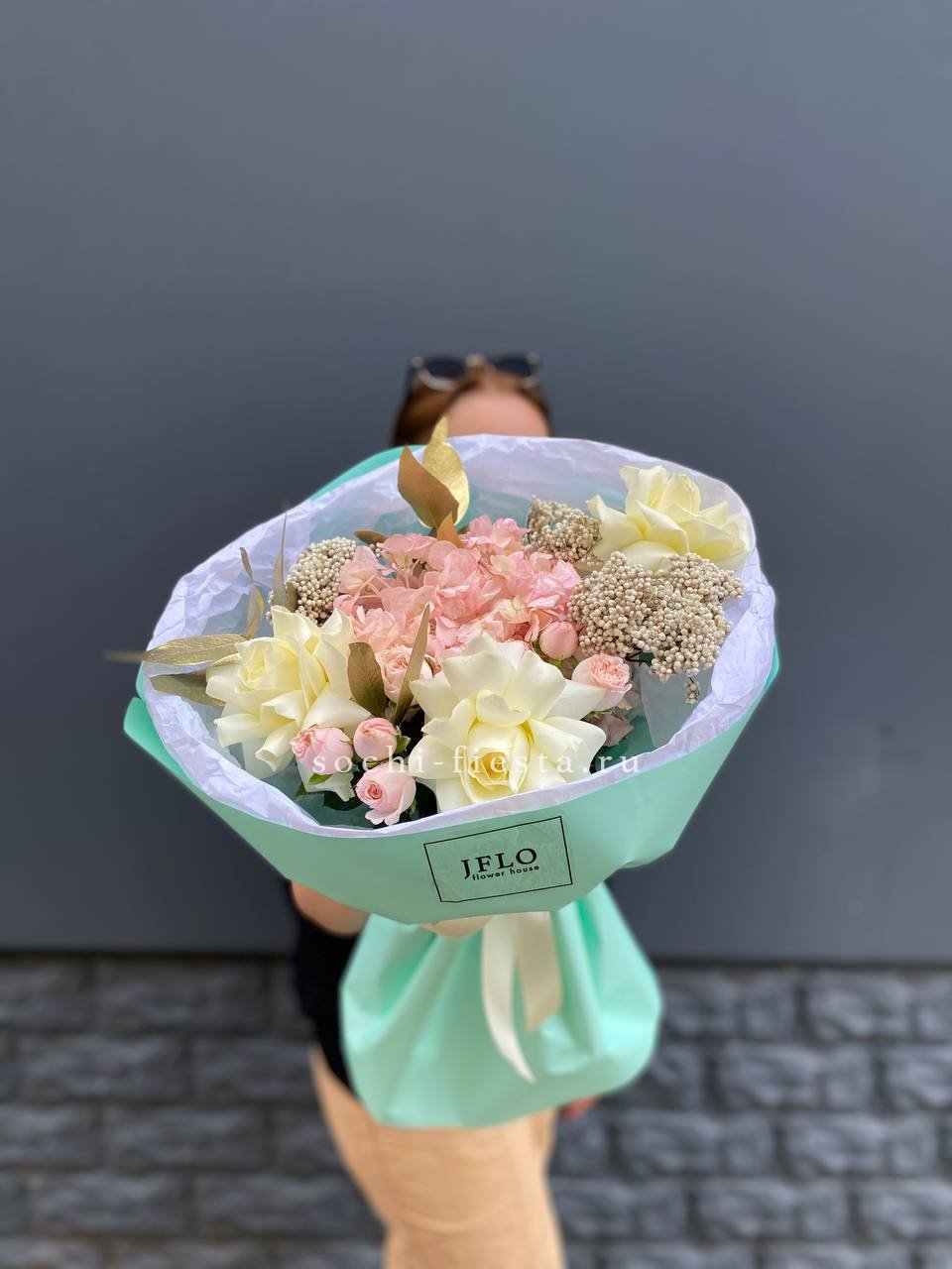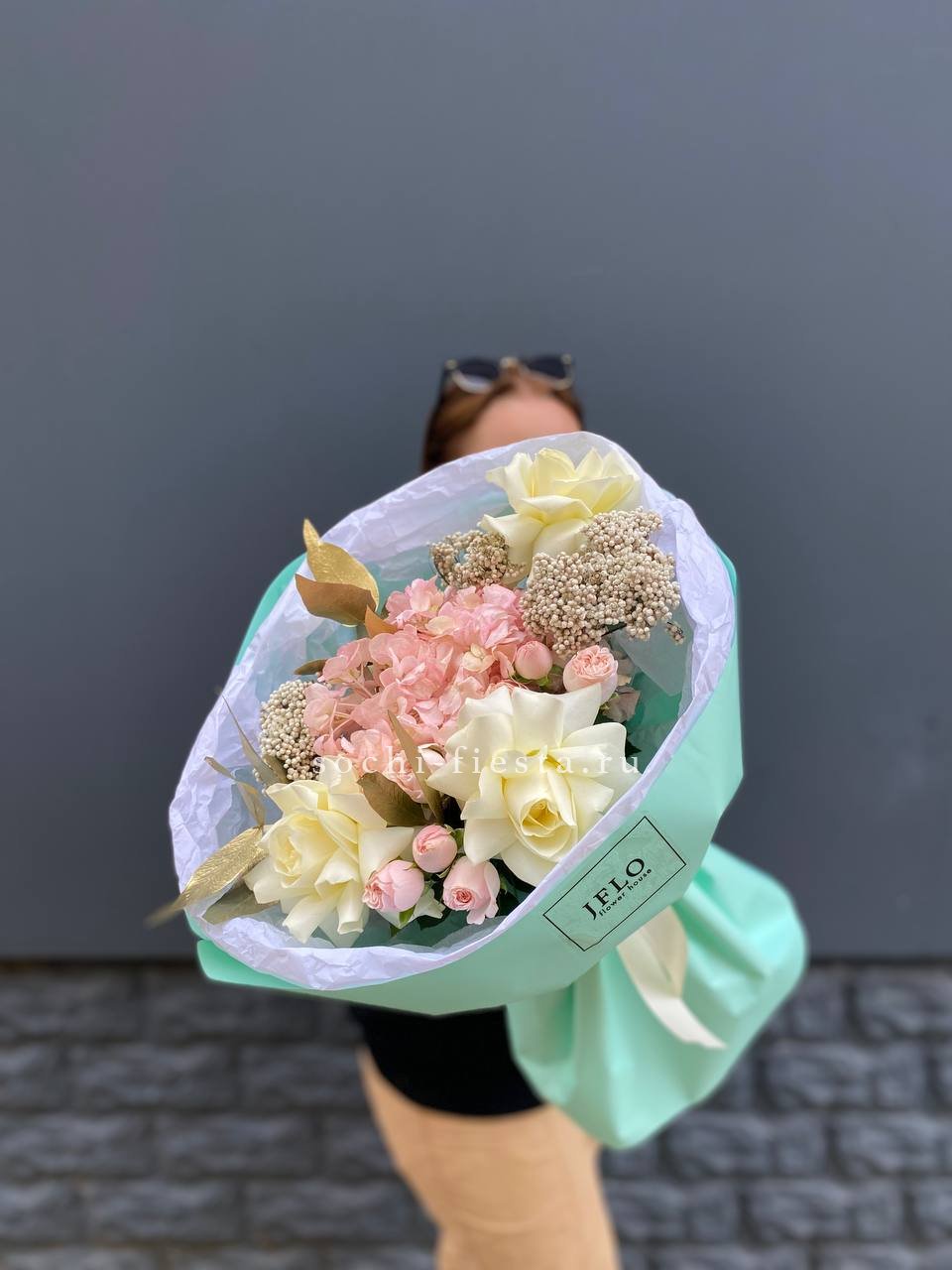 Состав: гортензия, белые розы, озатамус, бомбастик, эвкалипт в оформлении