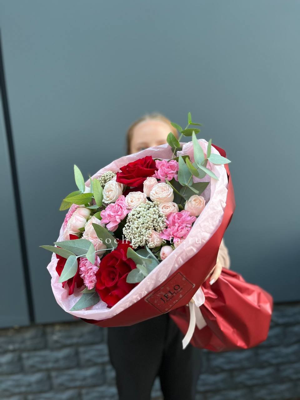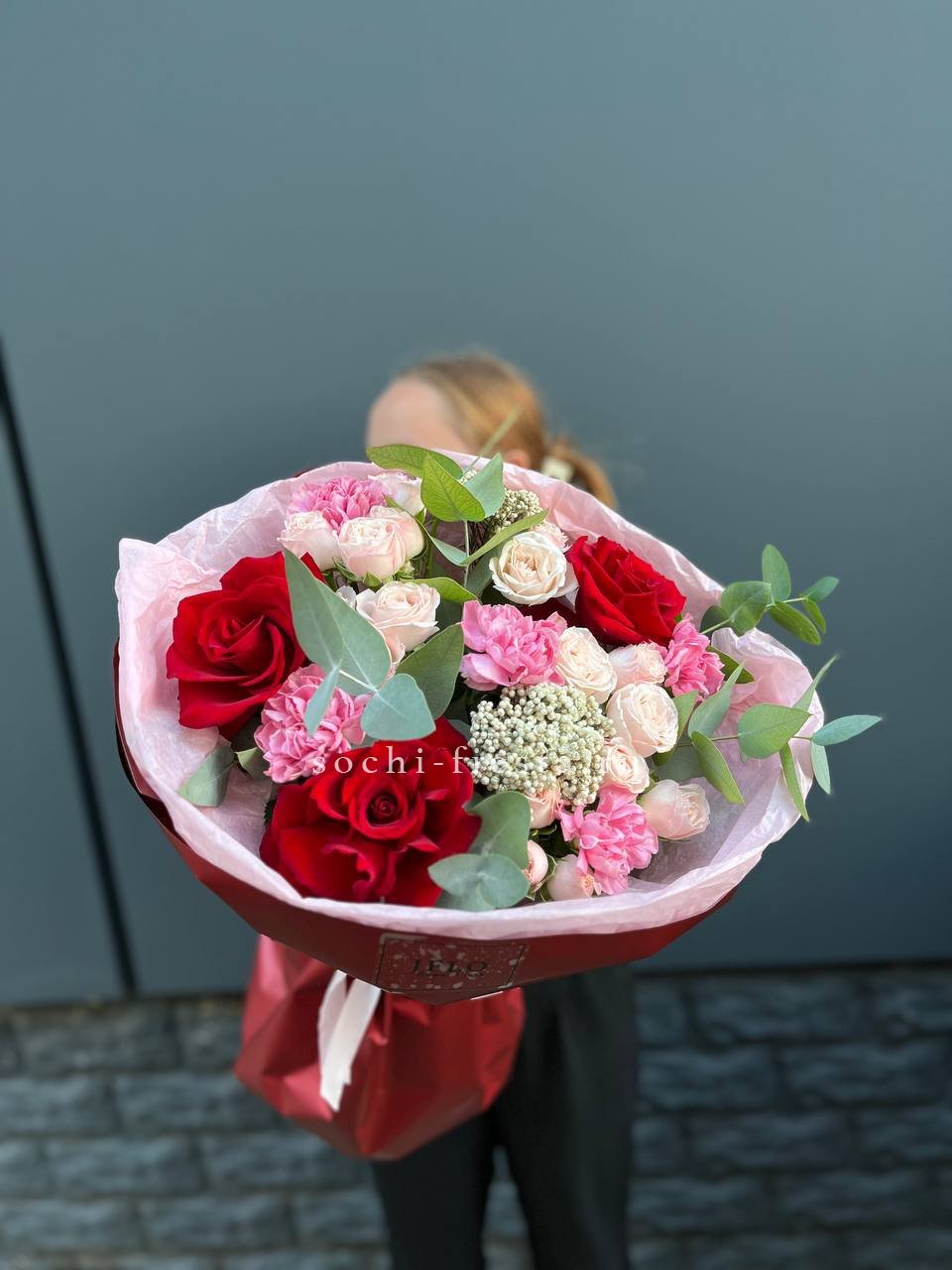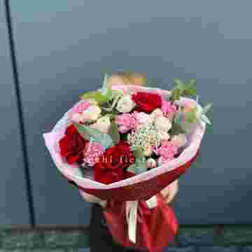 Состав: красная француская роза, диантусы, бомбастик, озатамус, эвкалипт, упаковка