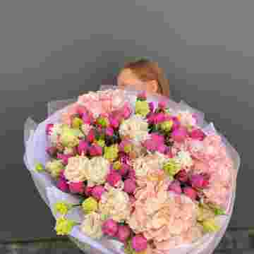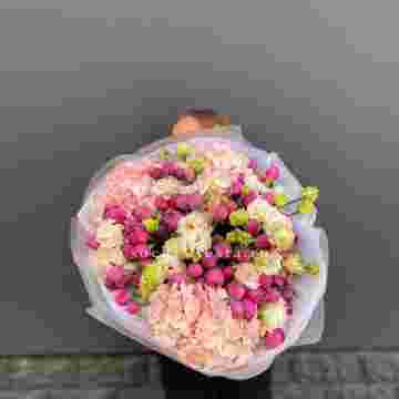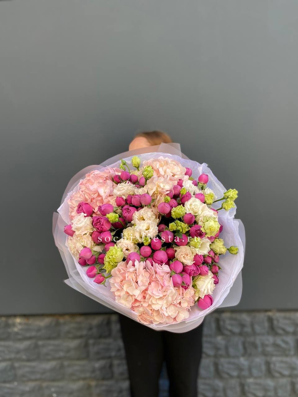 Состав: мисти баблс, гортензия, эустома, оформление.