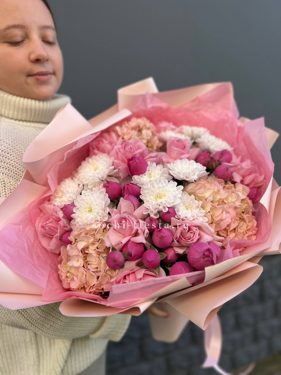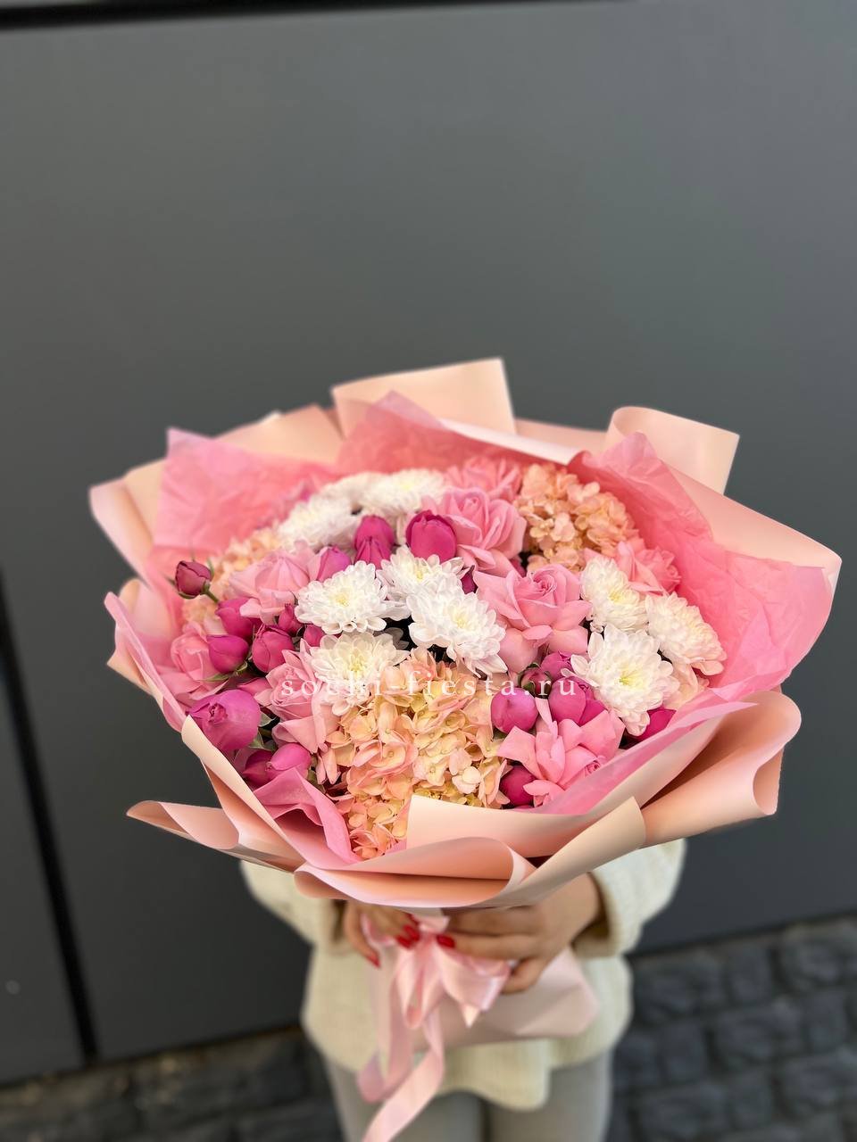 Состав: кремовые розы, эустомы (тон отличается от сезона), диантус, эвкалипт, оформление