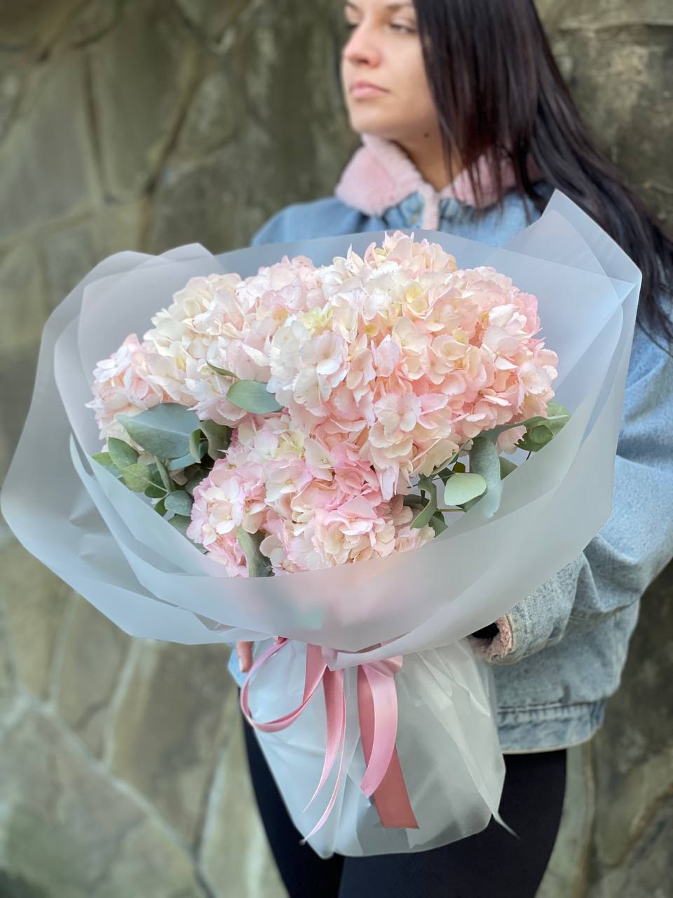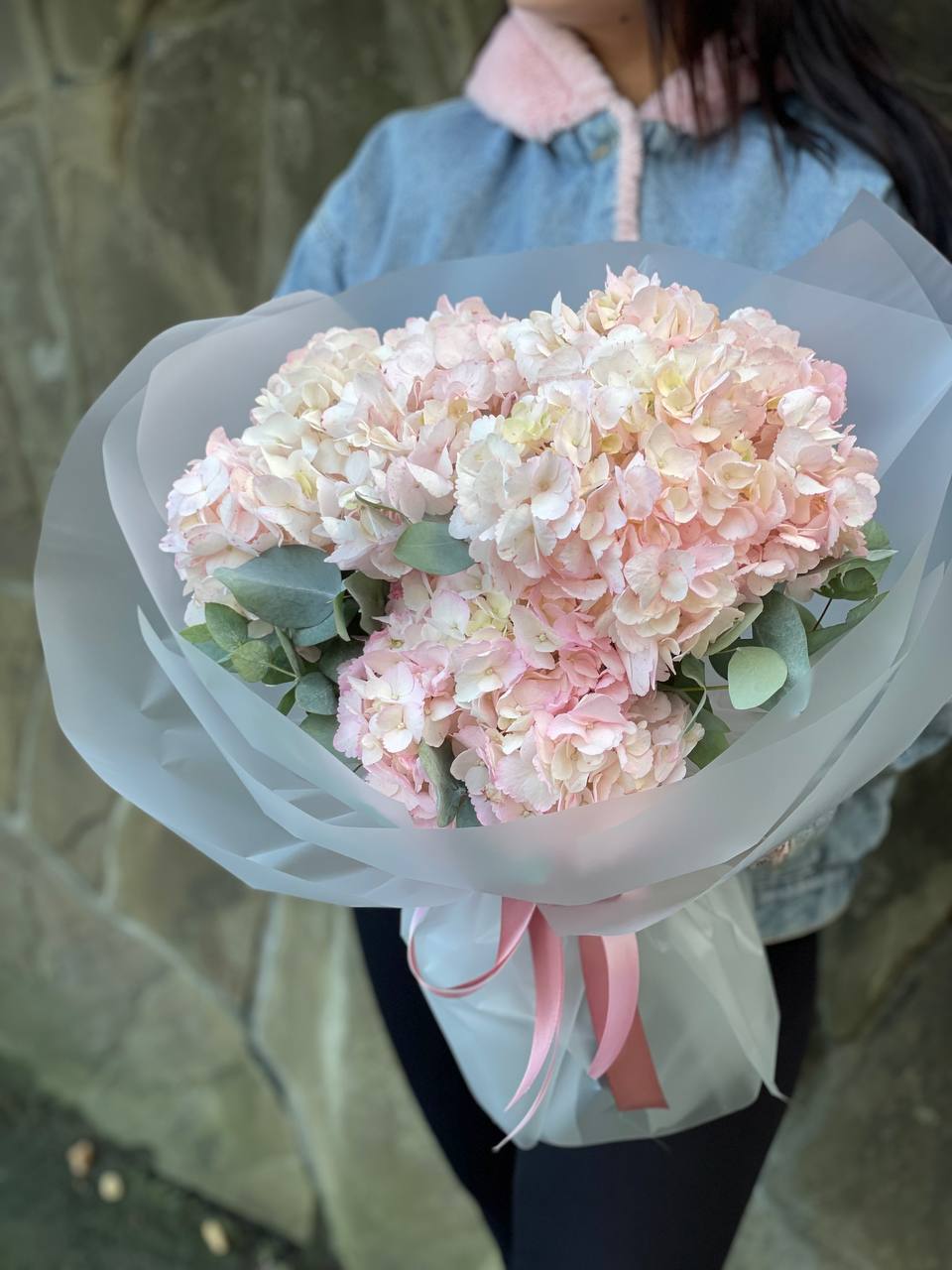 Пышные шапки гортензии задают объём, а россыпь кустовых роз создаёт живую текстуру по всей форме. Композиция наполнена воздухом и естественной лёгкостью.