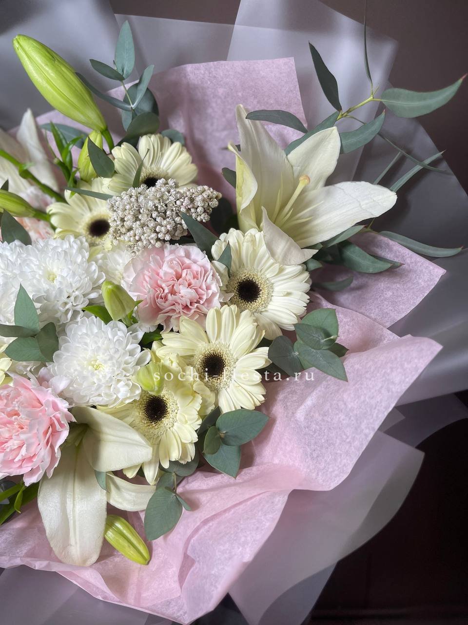 Состав: хризантемы, герберы, диантус, озатамус, лилии в оформлении