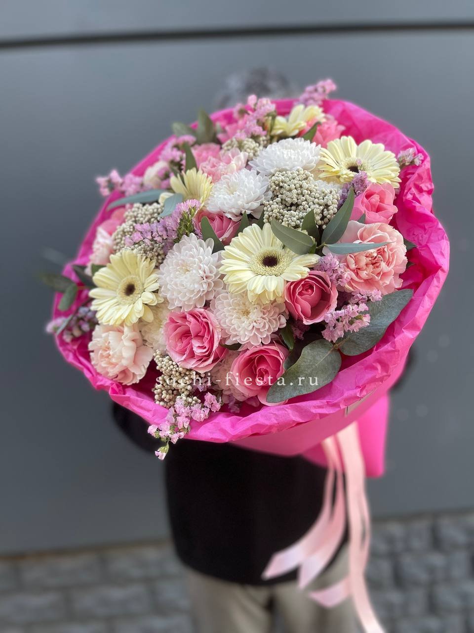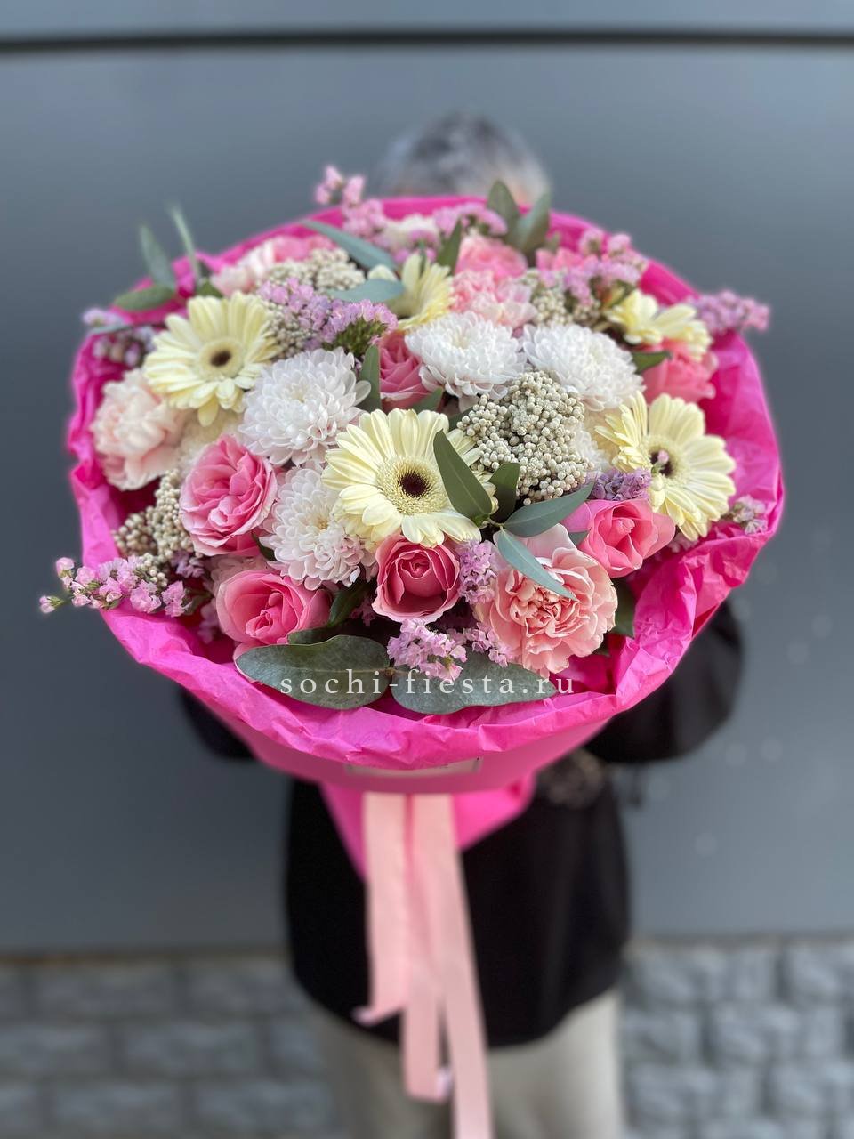 Состав: сборный букет из стойких цветов гербера, хризантема, розы, озатамус, эвкалипт, диантус, статица в оформлении