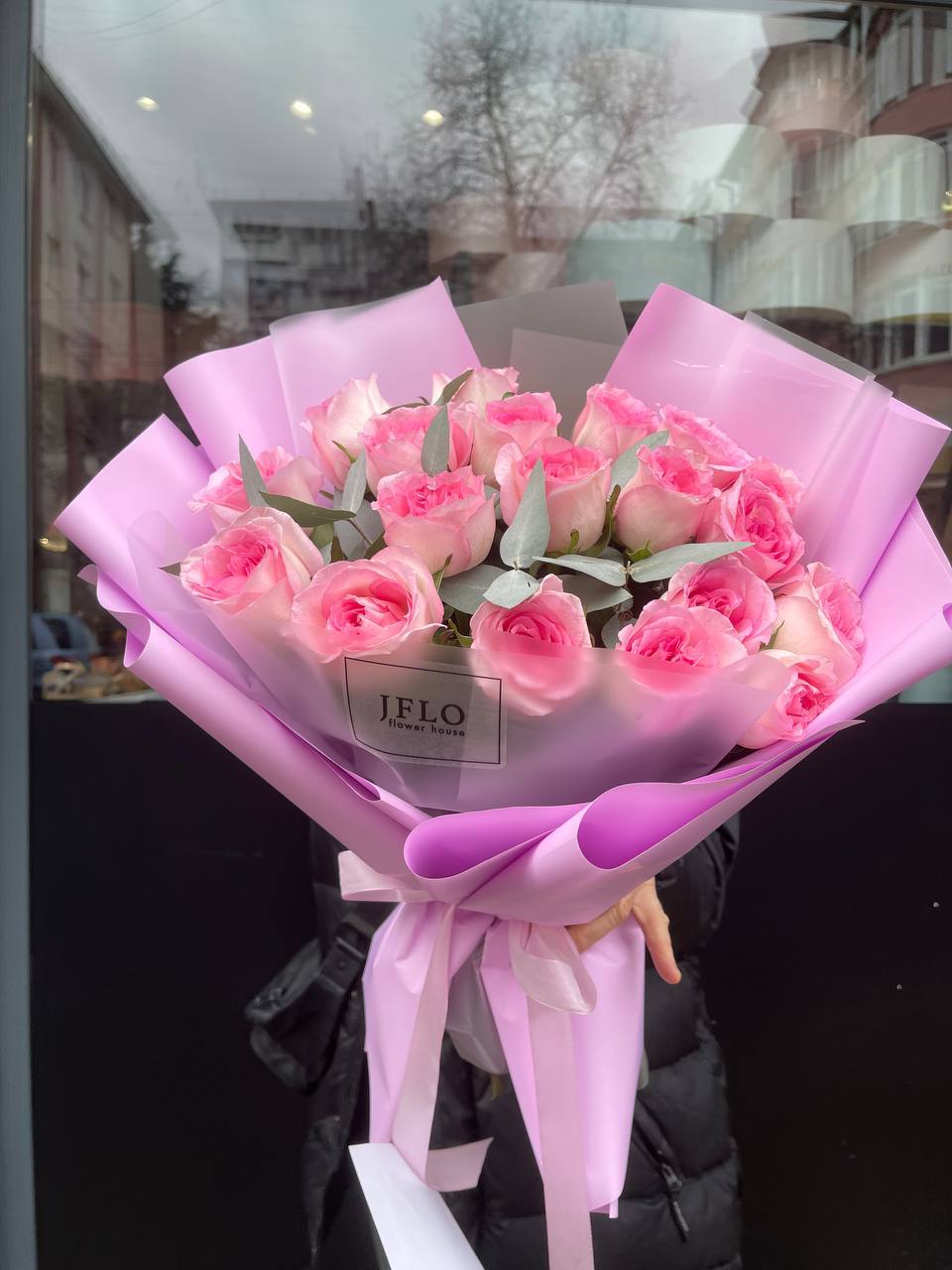 Розовые розы раскрываются среди воздушных соцветий гортензии и мелких бутонов диантуса. Озотамнус добавляет композиции лёгкость и объём. Букет собран плотно и держит форму без лишних деталей.