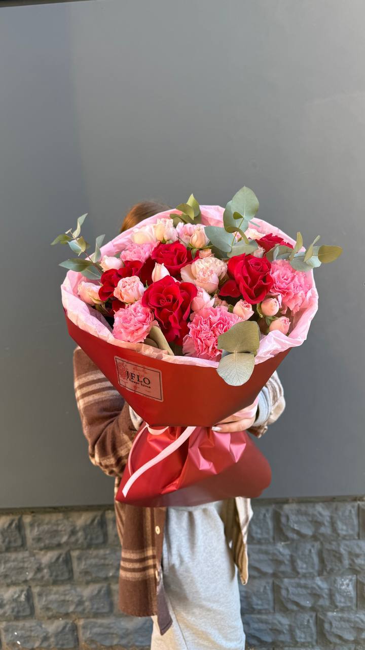 диантусы, бомбастик, красные розы, эвкалипт, оформление.