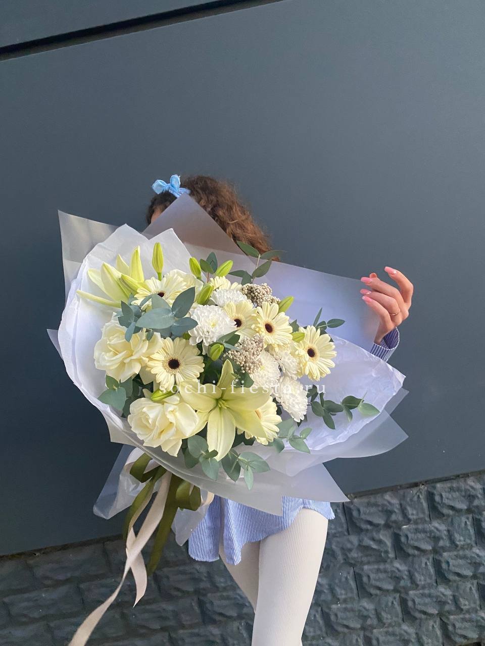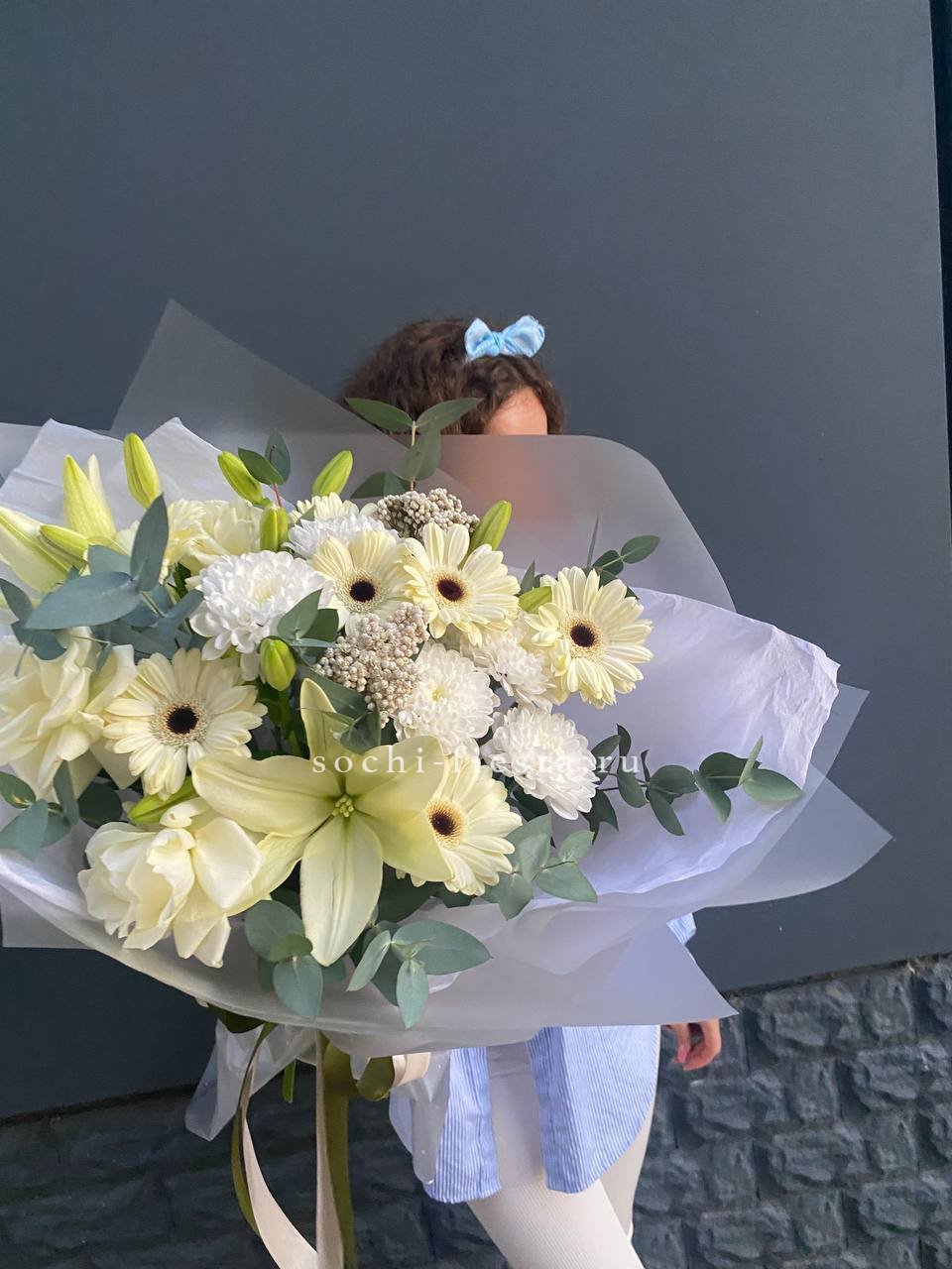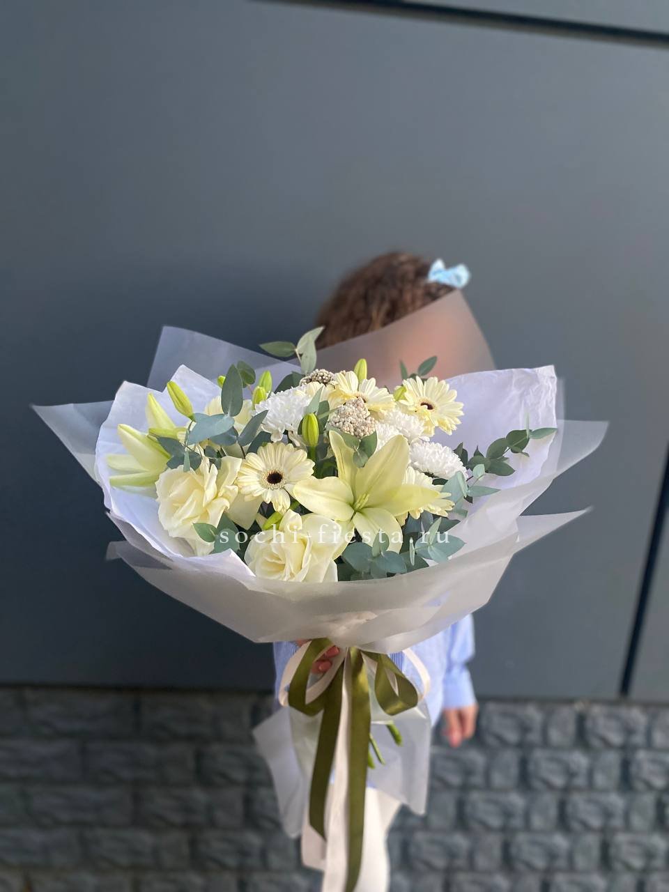 Состав: лилии, герберы, озатамус, белые розы в оформлении