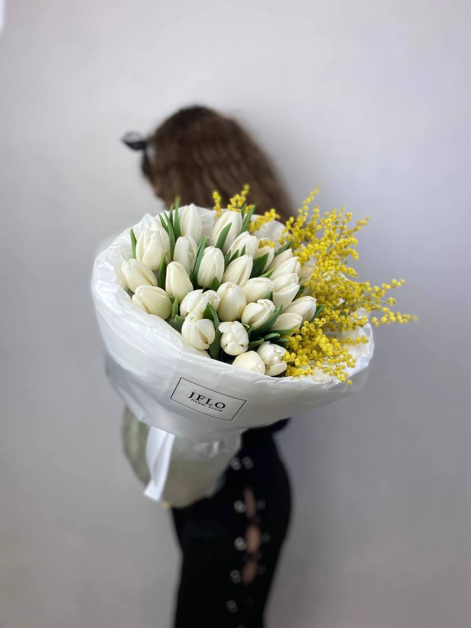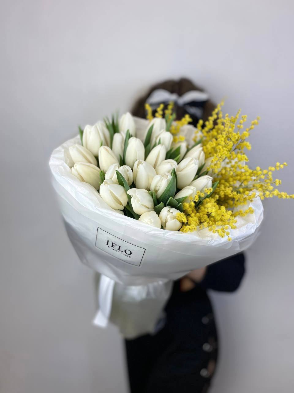 Белые бутоны и солнечные пушистые шарики собраны в плотную связку. Мимоза добавляет объём и весеннюю лёгкость строгим линиям тюльпанов. Букет держит форму и наполняет пространство свежестью.