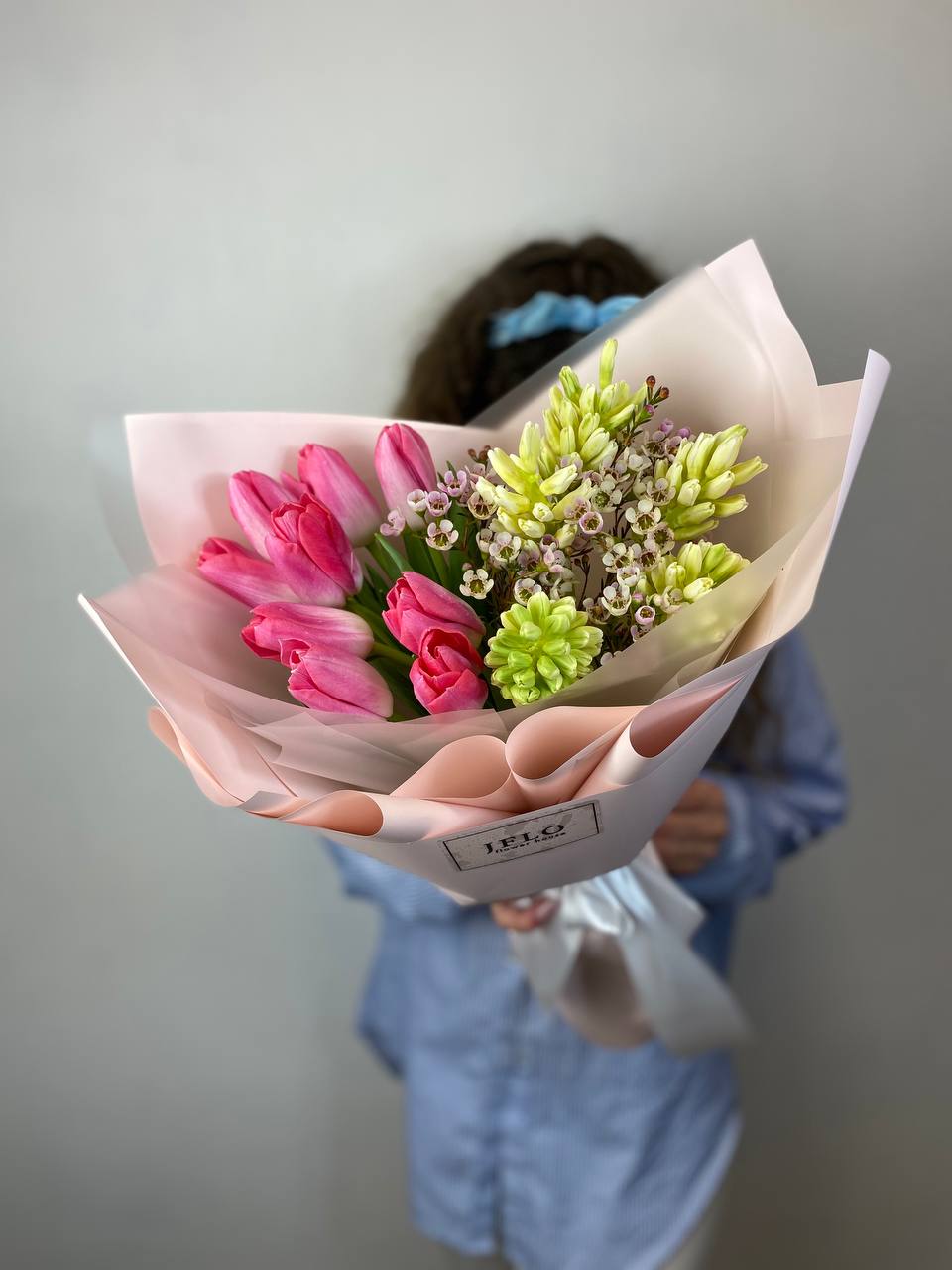 Весенний дуэт тюльпанов и гиацинтов собран в плотную композицию с воздушными веточками хамелациума. Бутоны раскрываются постепенно, наполняя пространство свежим ароматом и яркими красками. Букет сохраняет форму и радует несколько дней подряд.