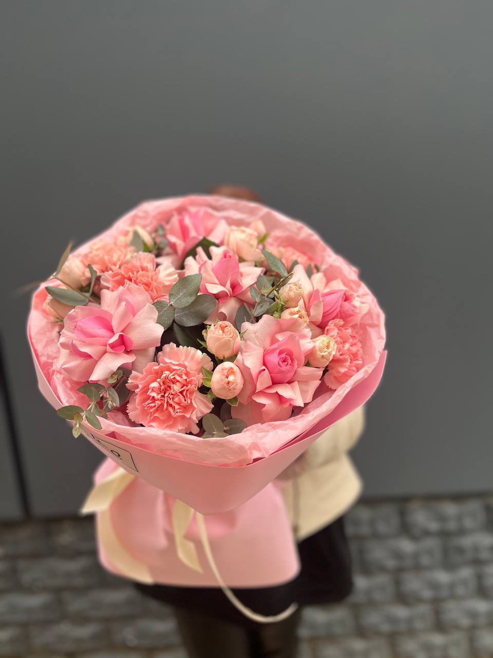 Диантусы и кустовые розы создают воздушную композицию с мягкими переходами оттенков. Бутоны распределены свободно, образуя естественный силуэт без жесткой геометрии. Букет хорошо держит форму и долго сохраняет свежесть.