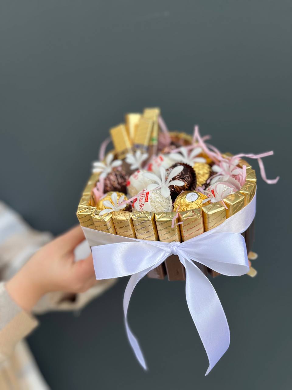 Состав: шоколад мерси, ферреро, рафаэло с искуственными цветочками в коробочке сердце