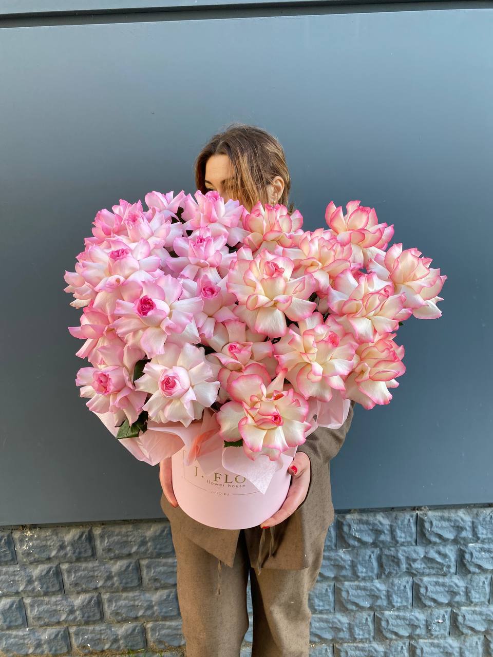 Двадцать пять вывернутых французских роз наполняют белый цилиндр графичной структурой. Бутоны раскрыты плотно, лепестки образуют многослойную текстуру с мягкими изгибами и глубиной.