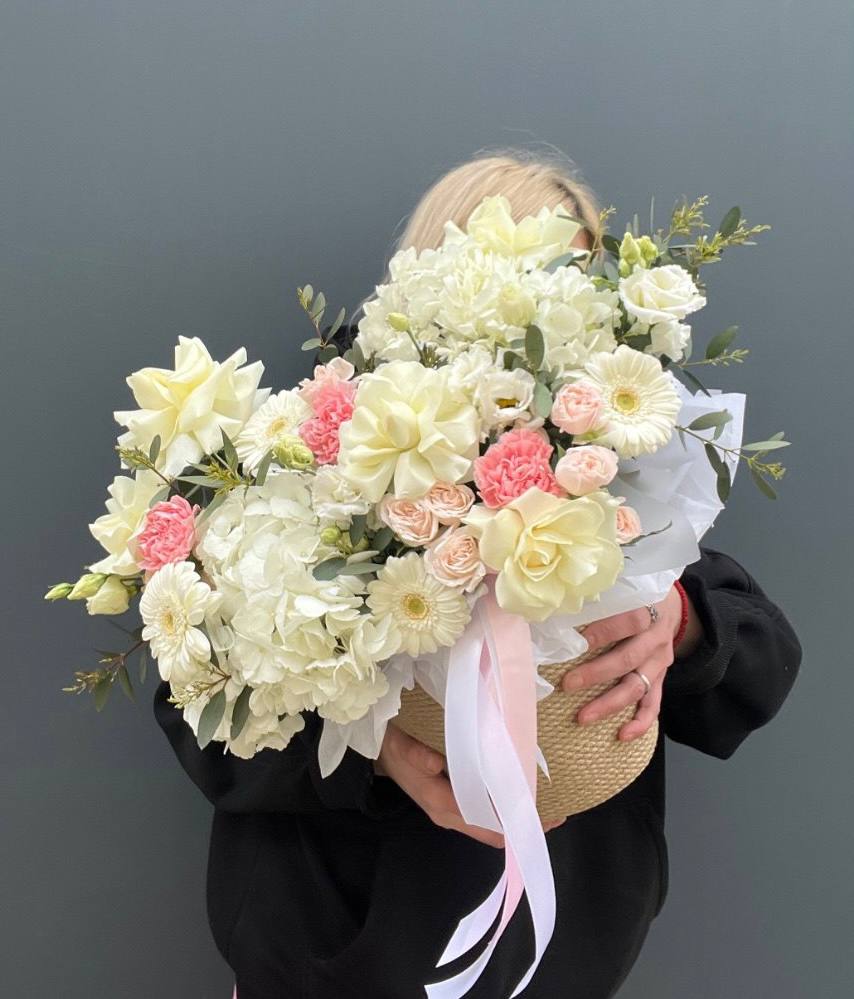гортензия, вывернутые розы, диантус, кустовая роза, эустома, бокс D20, тишью.