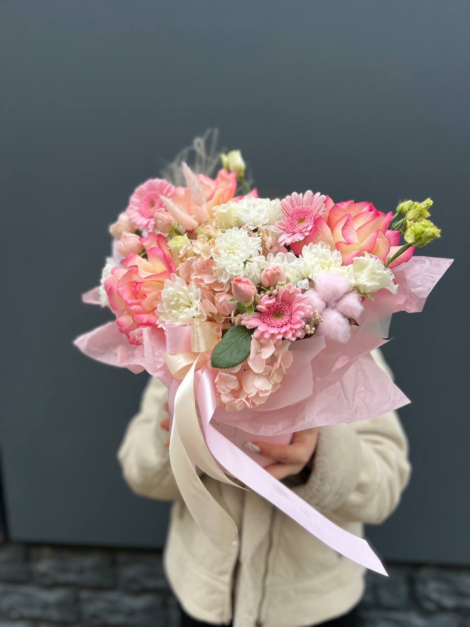Композиция в коробке объединяет пышную гортензию, воздушную эустому и кустовые розы, Джумилию с яркими гербами и хлопком. Плотное заполнение создает округлую форму, где каждый цветок находит свое место без пустот.