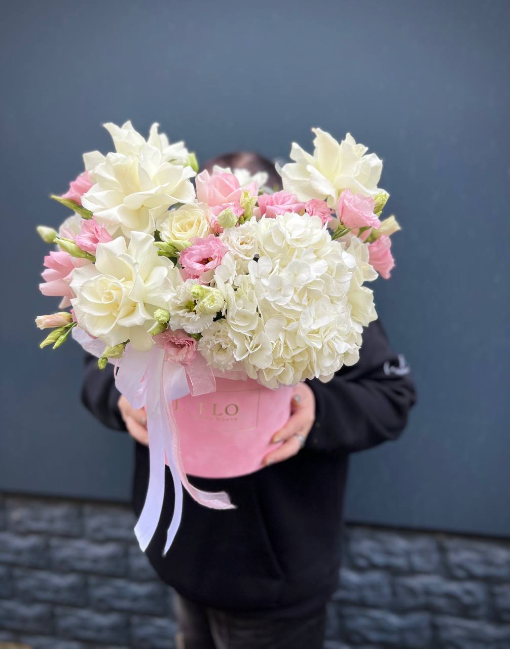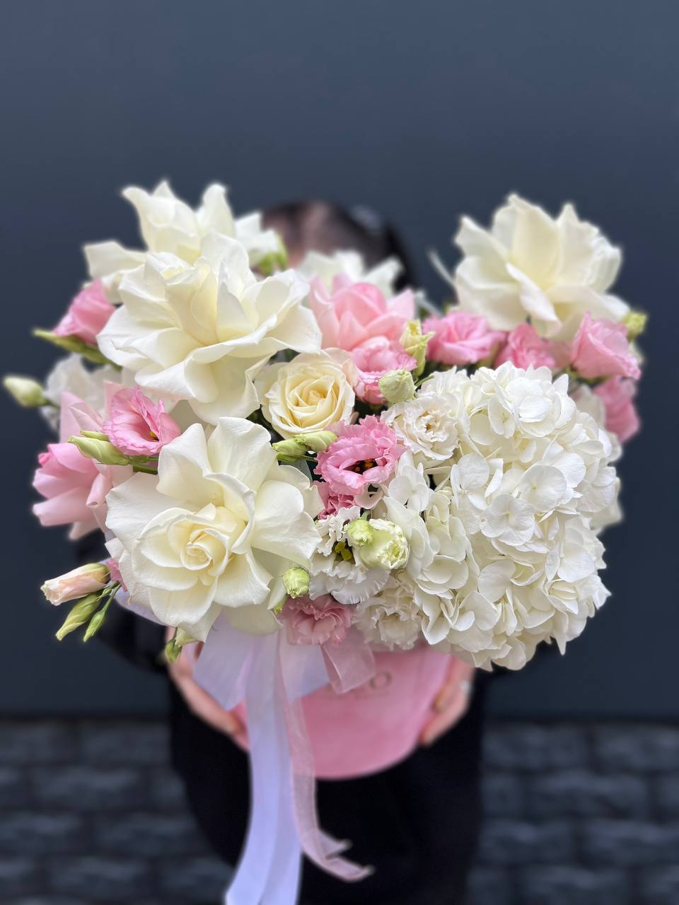 гортензия, розы, озотамус, диантус, бомбастик, хлопок, хризантема бокс 16.
