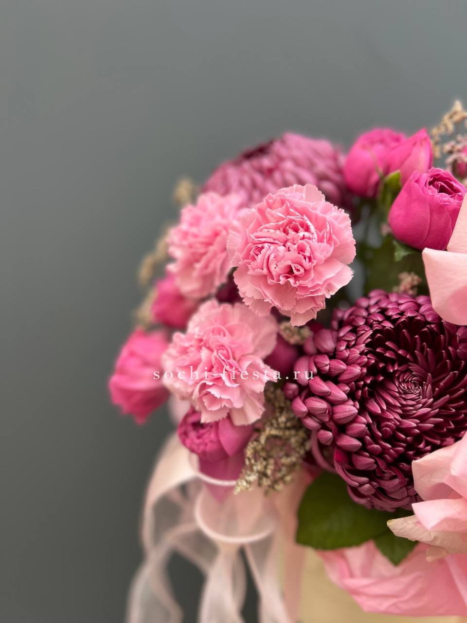 Состав: выполнен из хризантем, роз, мисти бабблс, диантусов, лимониума,  цилиндр D16