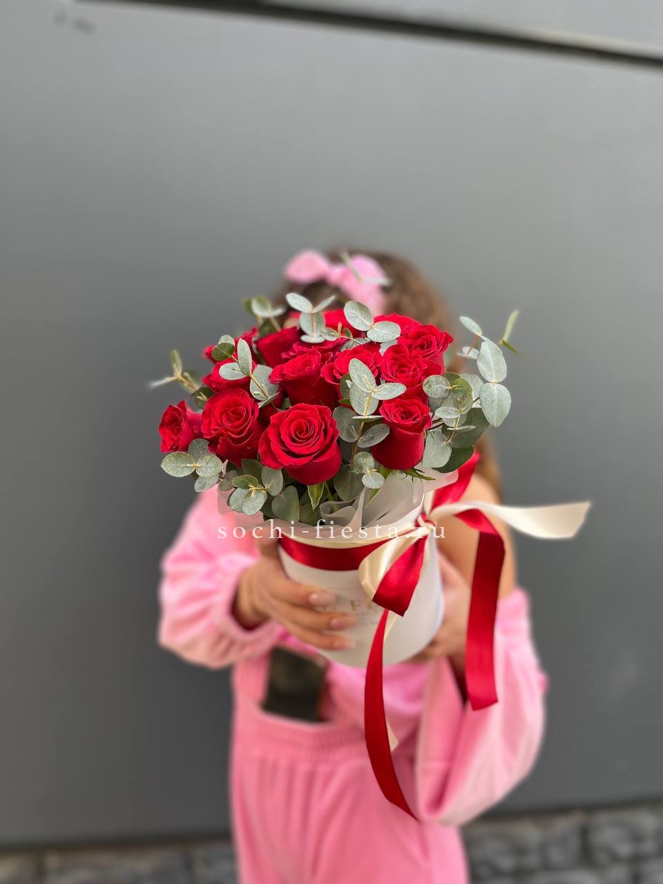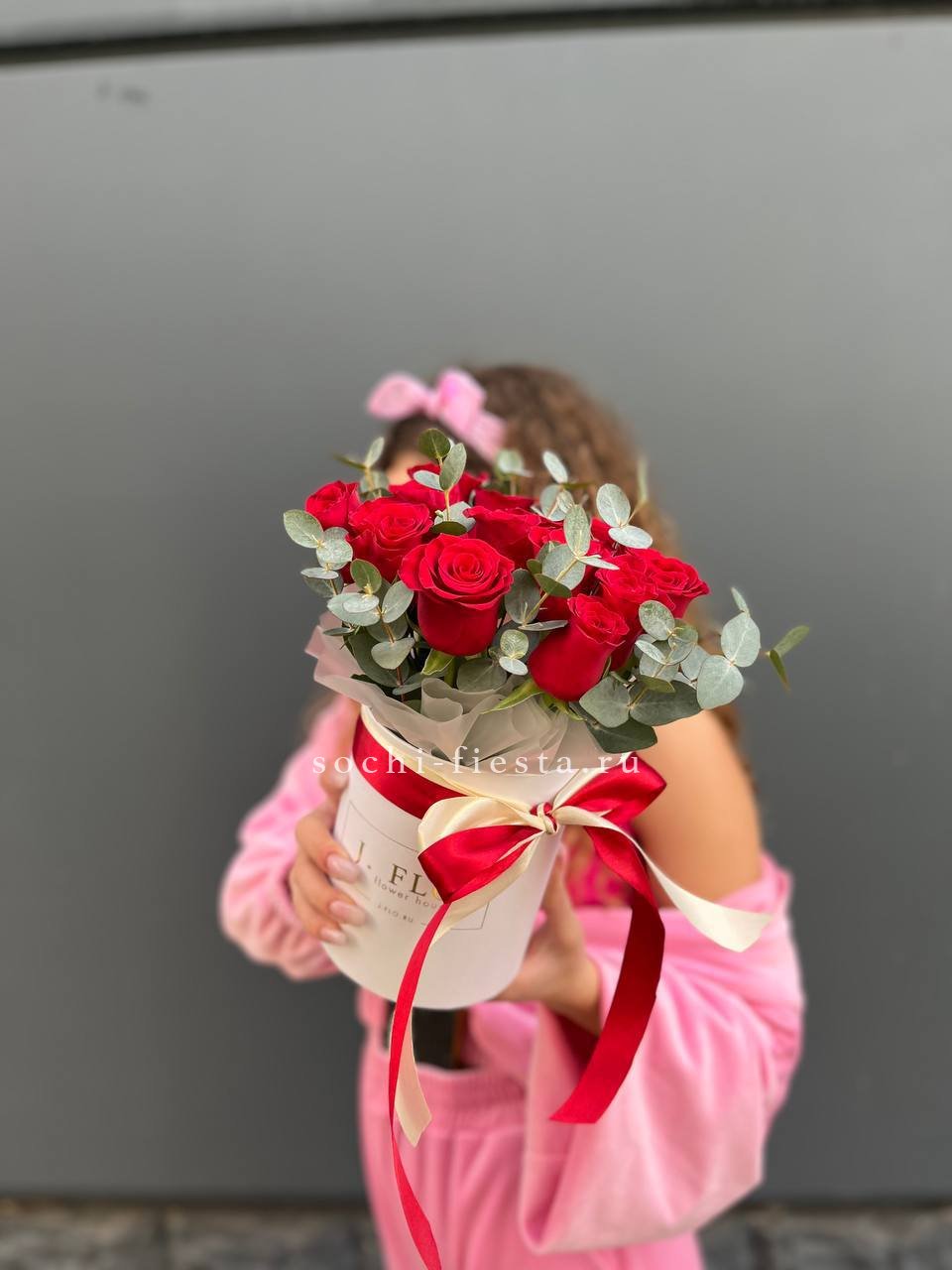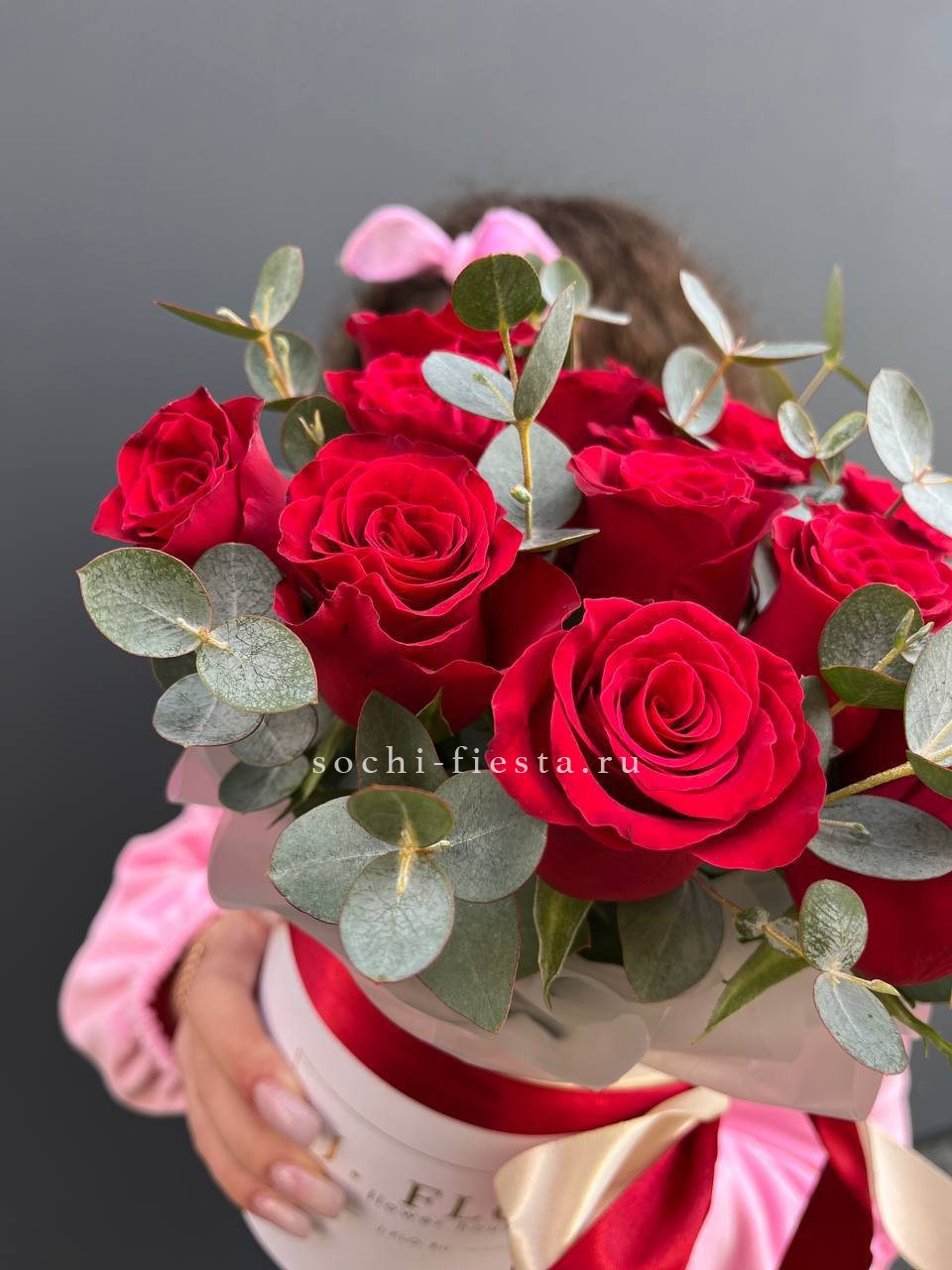 Состав: красные розы - 15 шт., эвкалипт, цилиндр D16, лента