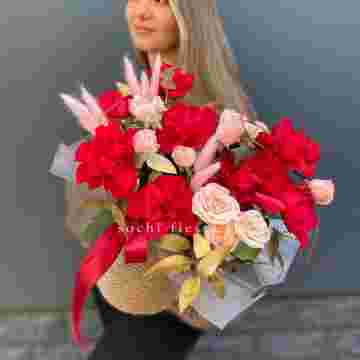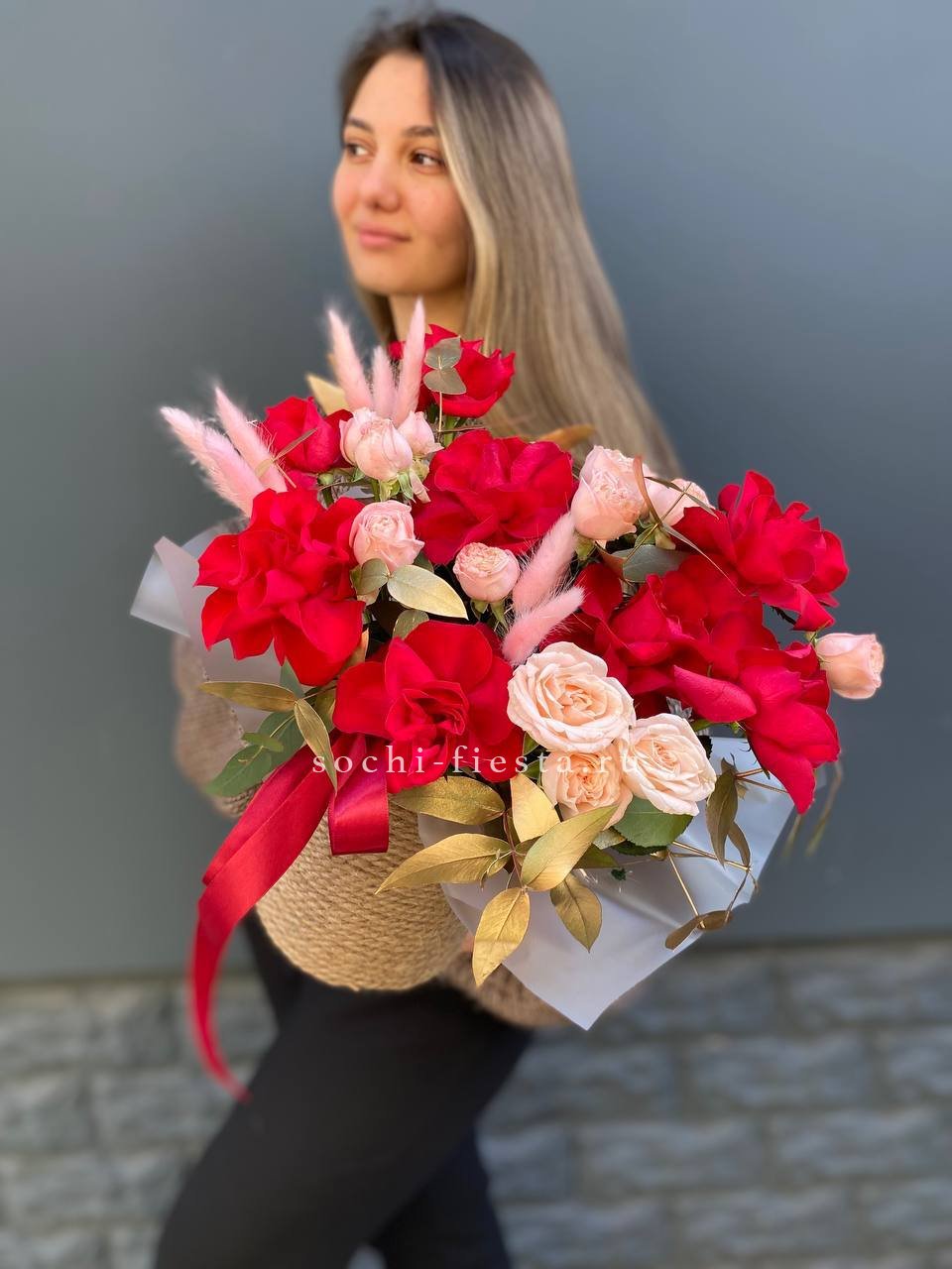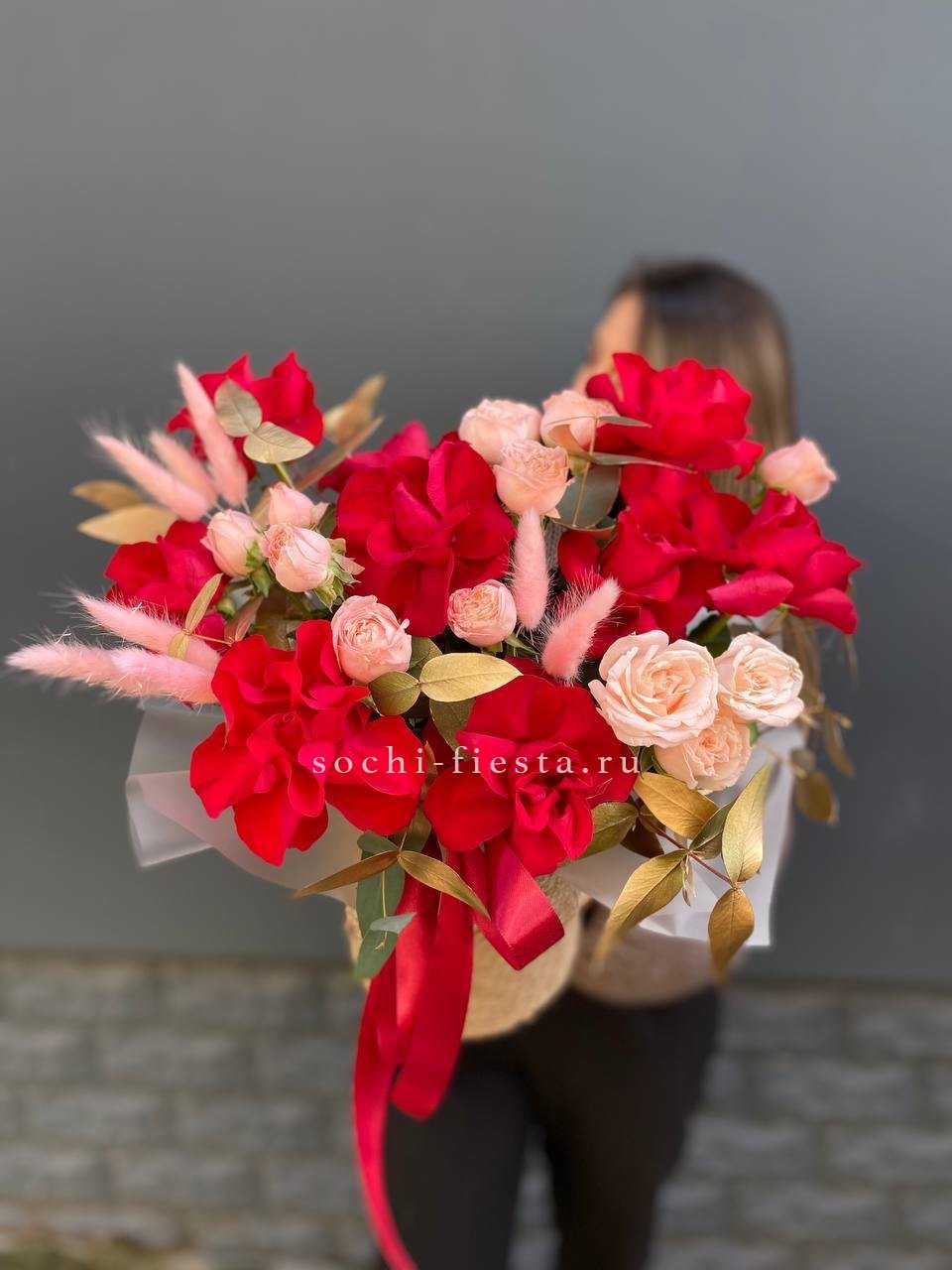 Состав: красная роза, бомбастик, лагурус, золотой эвкалипт, джутовое кашпо
