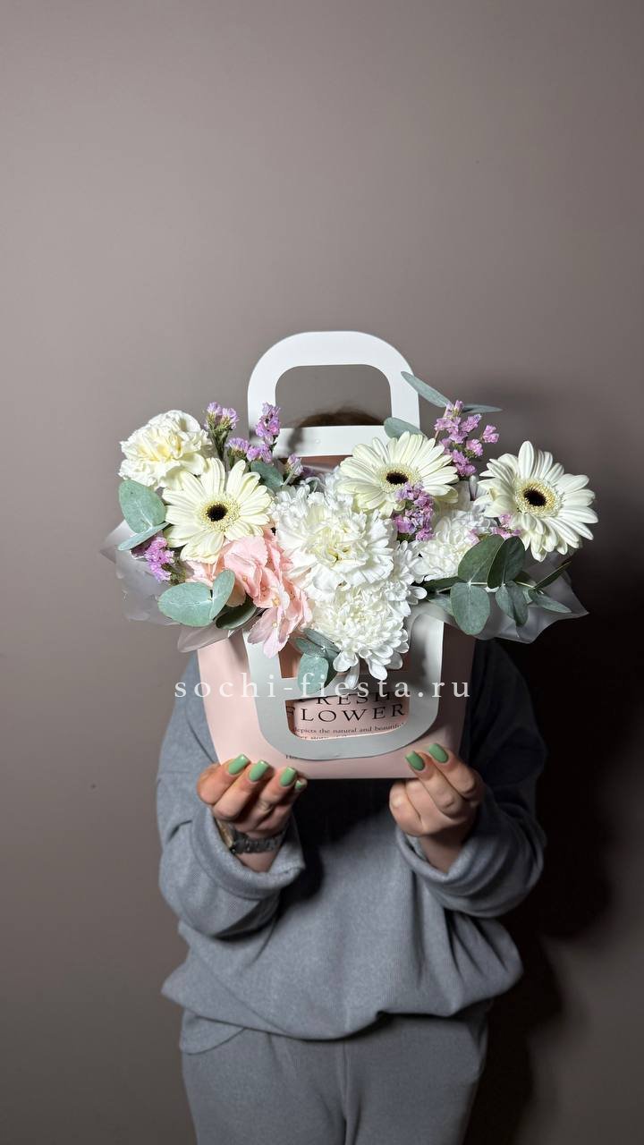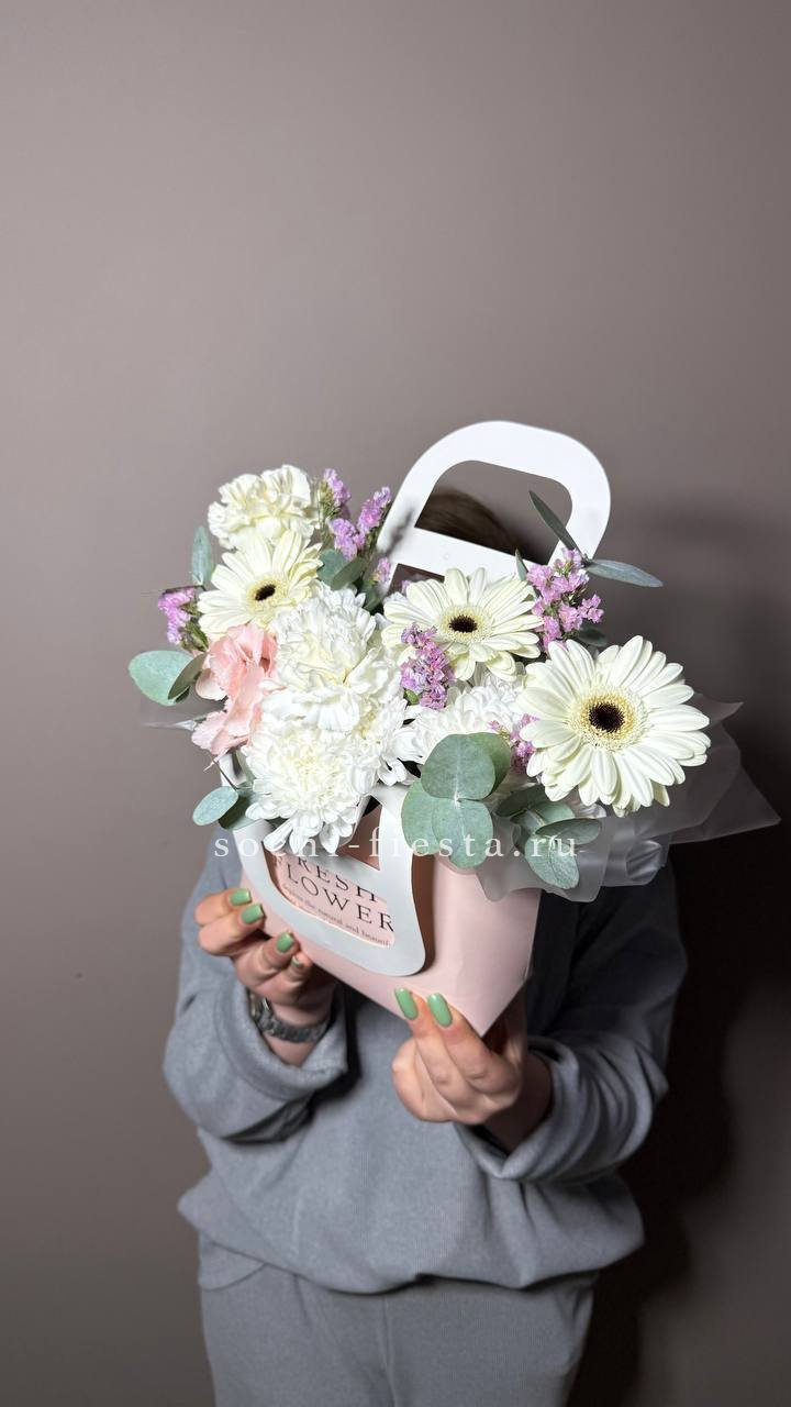Состав: гербера, хризантема, диантус, статица, гортензия, сумочка