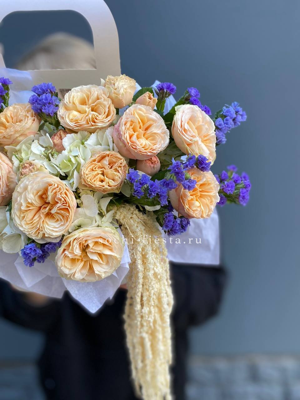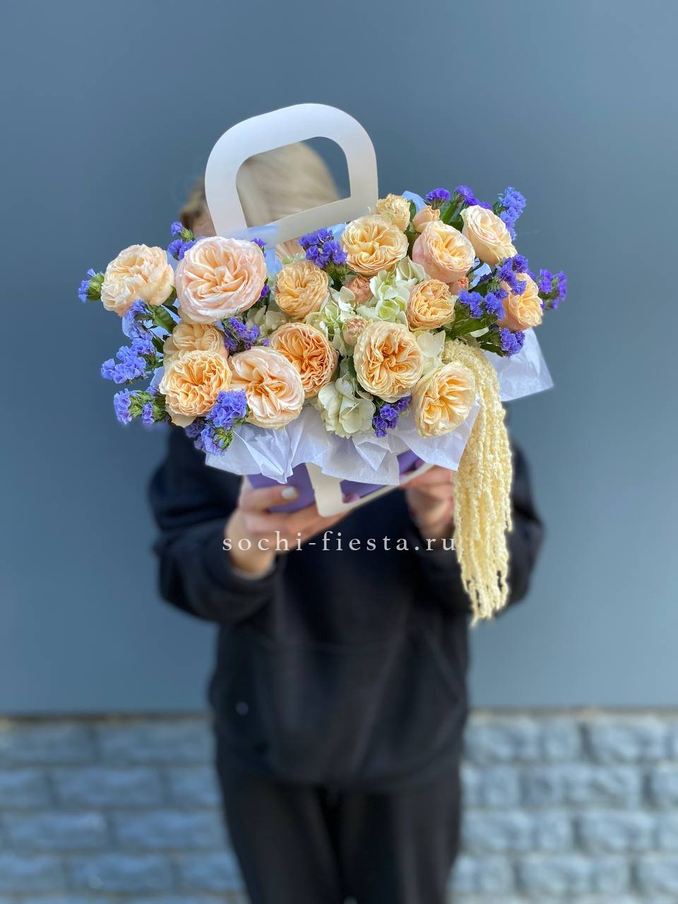 Состав: сумочка из кустовых роз, гортензии и статицы.