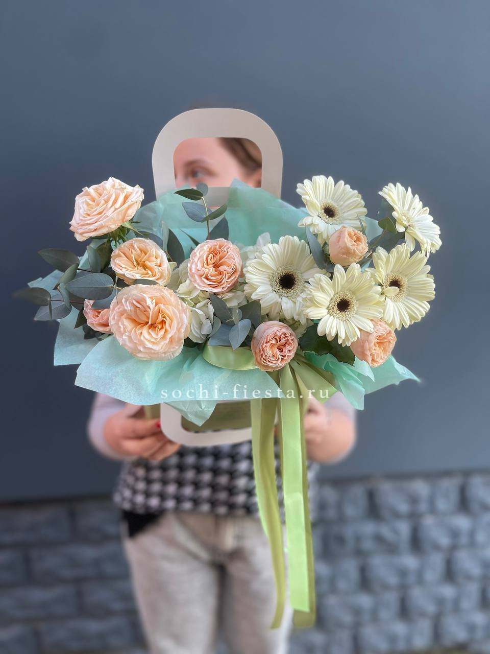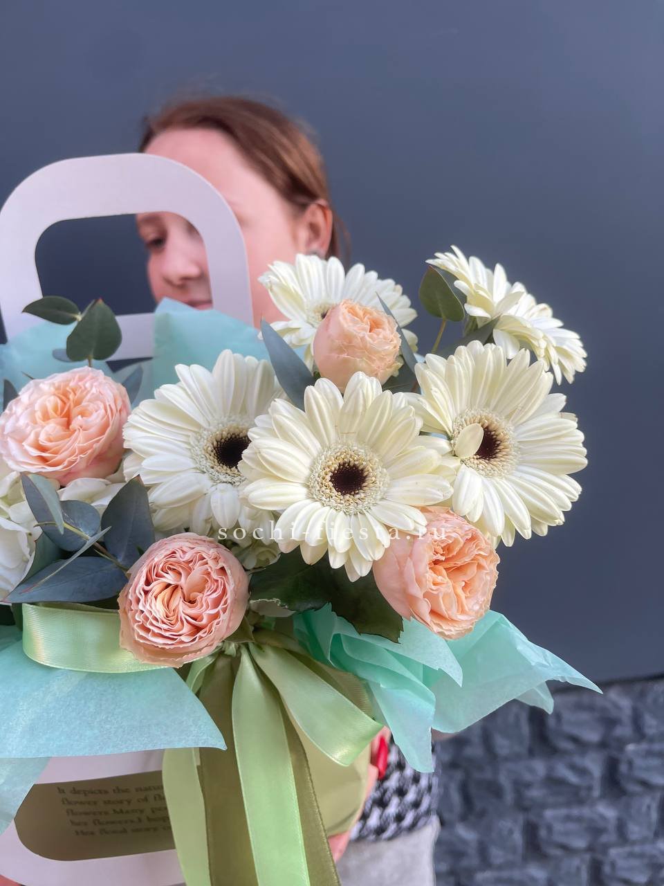 Состав: сумочка из гортензии, кустовой розы, герберы и эвкалипта.