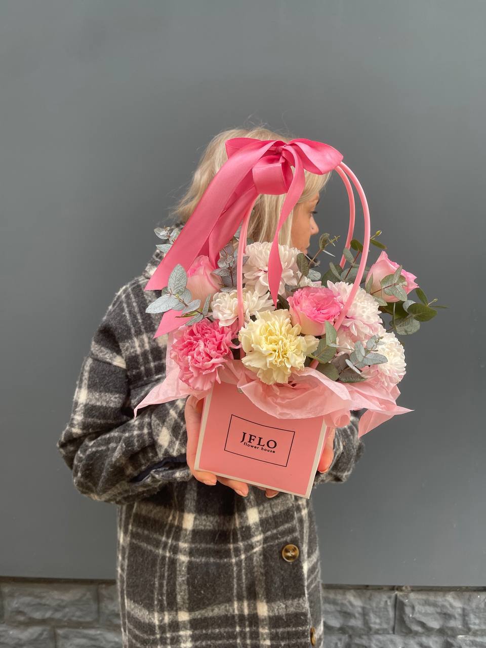 Миниатюрная композиция в удобной сумочке сочетает пышные головки хризантем с бархатистыми розами и воздушным диантусом. Веточки эвкалипта добавляют свежести, а компактная форма позволяет разместить цветы на рабочем столе или прикроватной тумбе.
