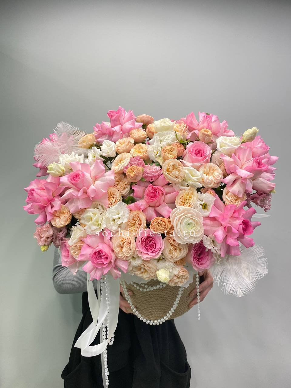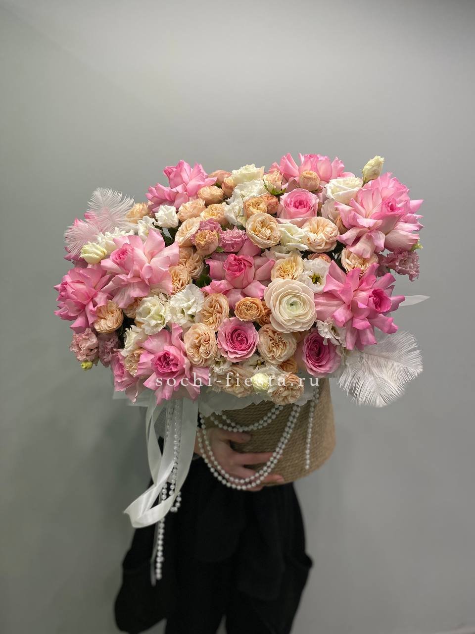 Состав: пионы, кустовая пионовидная роза, маттиола, пиафлор, плетеный бокс или корзина D40