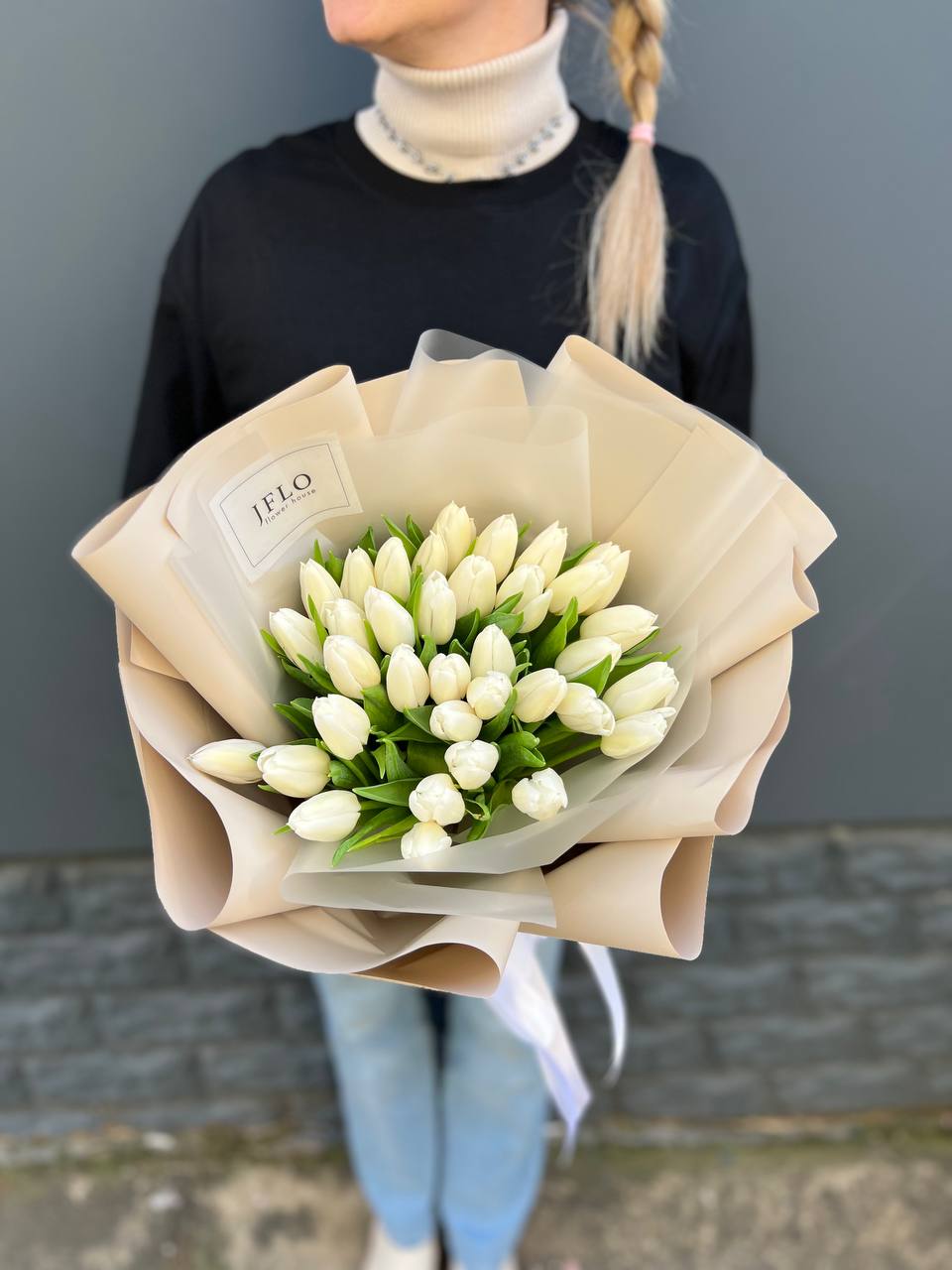 Тридцать пять тюльпанов собраны в плотный монохромный букет, где белизна лепестков создаёт почти графичное впечатление. Чистая форма без лишних деталей позволяет раскрыться природной архитектуре каждого бутона.