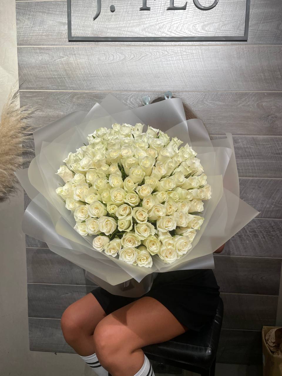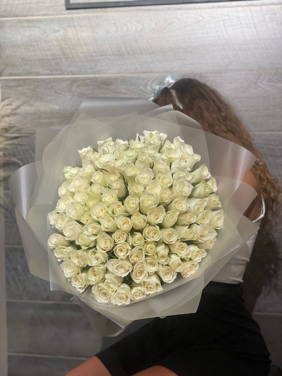 Сто один высокий стебель формирует внушительную композицию с безупречной геометрией. Белые головки на длинных ножках создают визуальный эффект монументальности. Присутствие, которое невозможно не заметить.