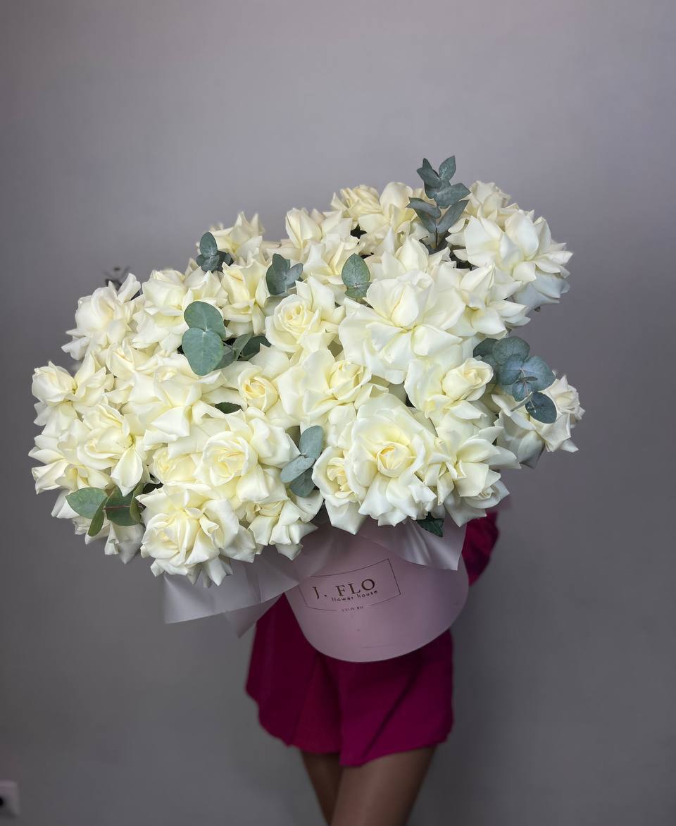 белые французские розы в боксе с эвкалиптом.