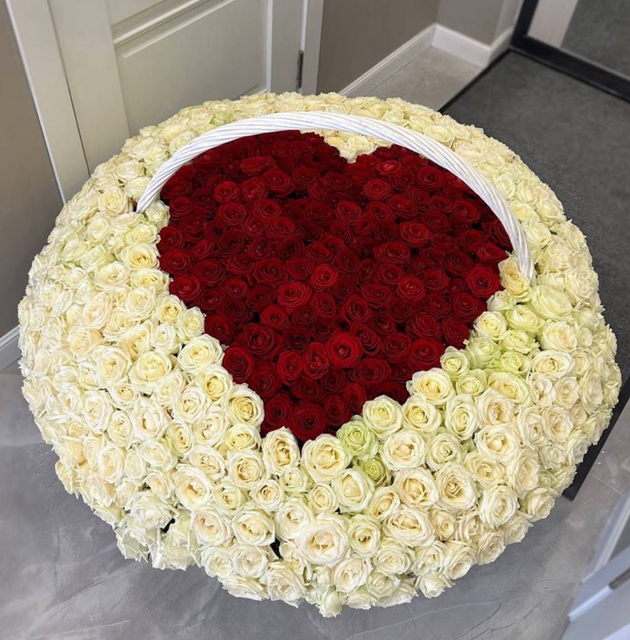 Двадцать три бутона выстроены в плотную округлую форму с чёткими линиями и выразительным силуэтом. Французские розы держат форму уверенно, а свежая зелень добавляет композиции графичности и завершённости.