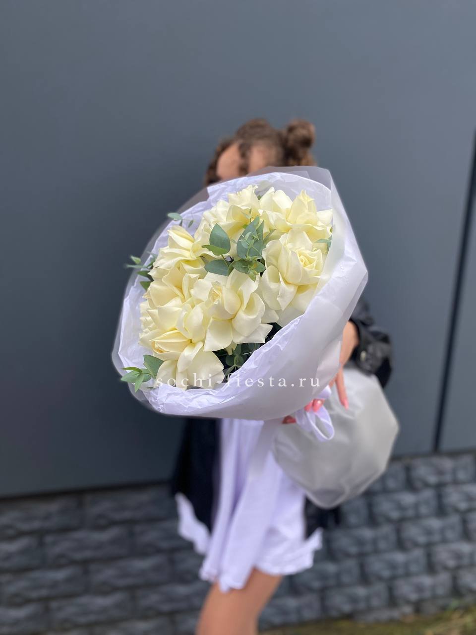 Состав букета на фотографии: французские розы - 23 шт., эвкалипт-3 шт, лента, авторская упаковка