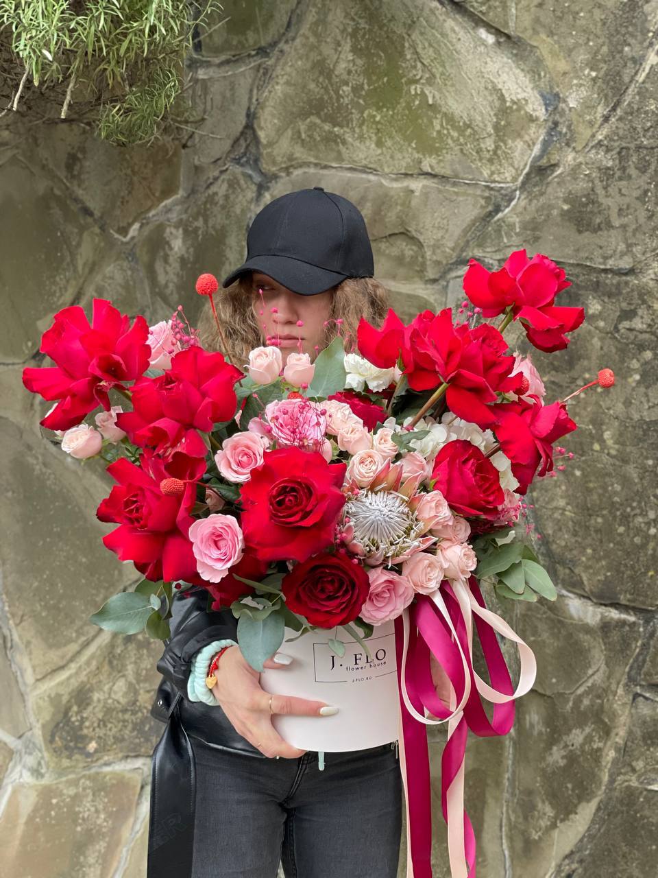 Пятьдесят пять бутонов собраны в плотную округлую форму, где каждый цветок читается отдельно. Красный здесь звучит насыщенно и глубоко, создавая мощное визуальное присутствие. Букет держит форму и занимает пространство уверенно.