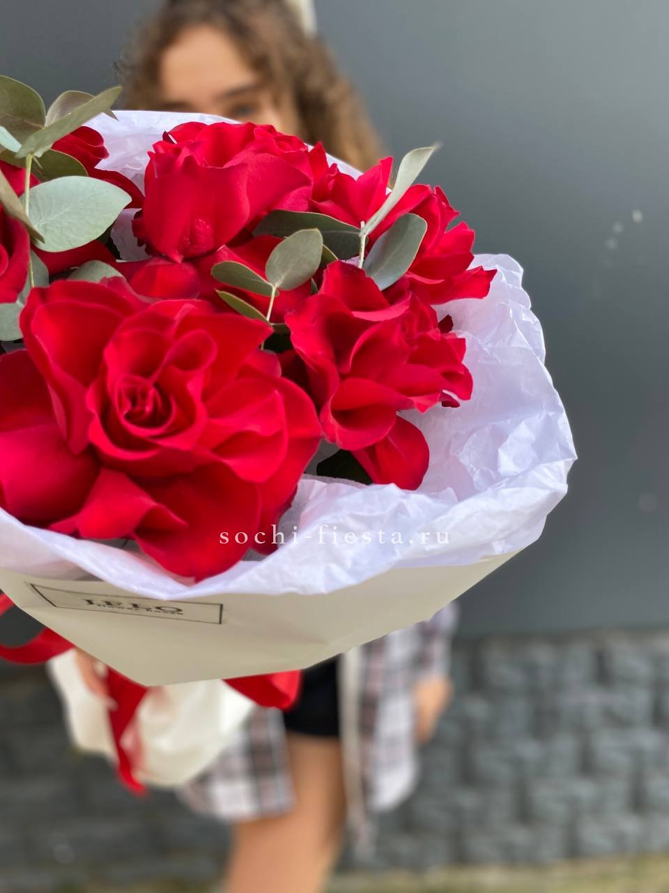 Состав: красные розы в оформлении с эвкалиптом