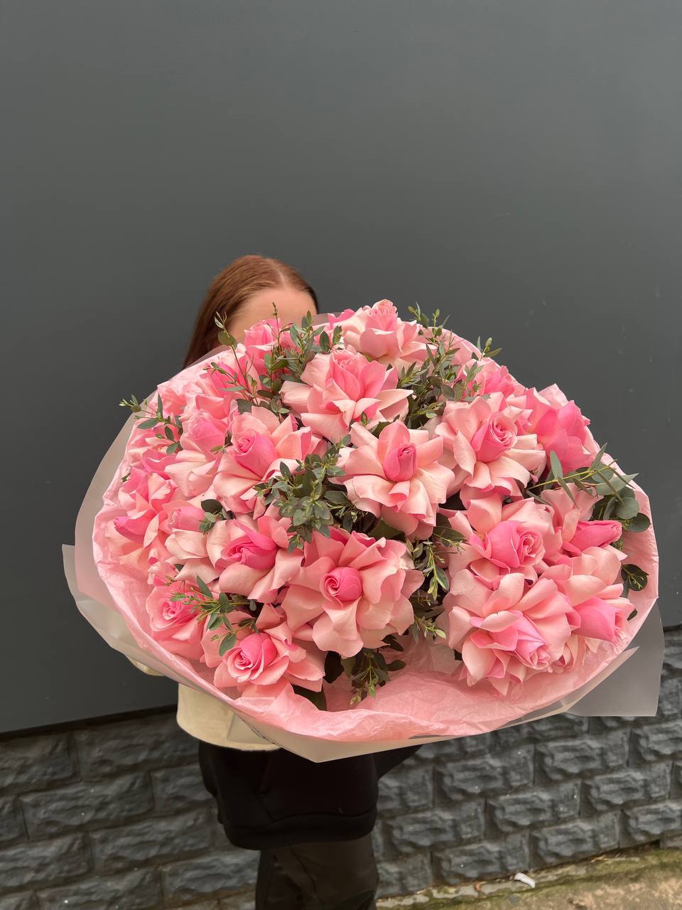 Розовые французские розы в воздушном оформлении дарят ощущение легкости и света. Двадцать пять бутонов создают объемное облако, которое наполняет пространство свежестью и теплом.