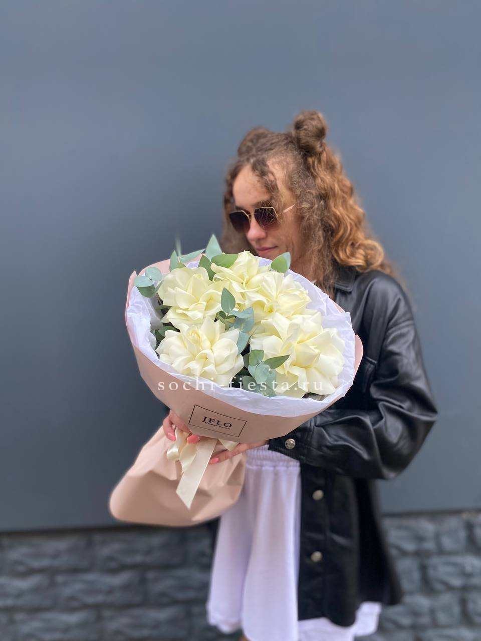 Состав букета на фотографии: вывернутые розы - 5 шт., эвкалипт - 2шт., лента, авторская упаковка