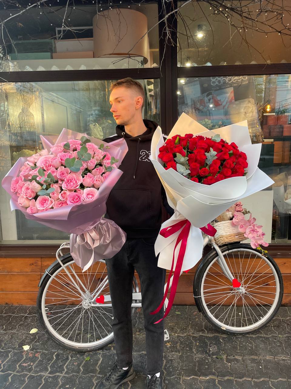 кустовая пионовидная роза, лента, дизайнерская упаковка.